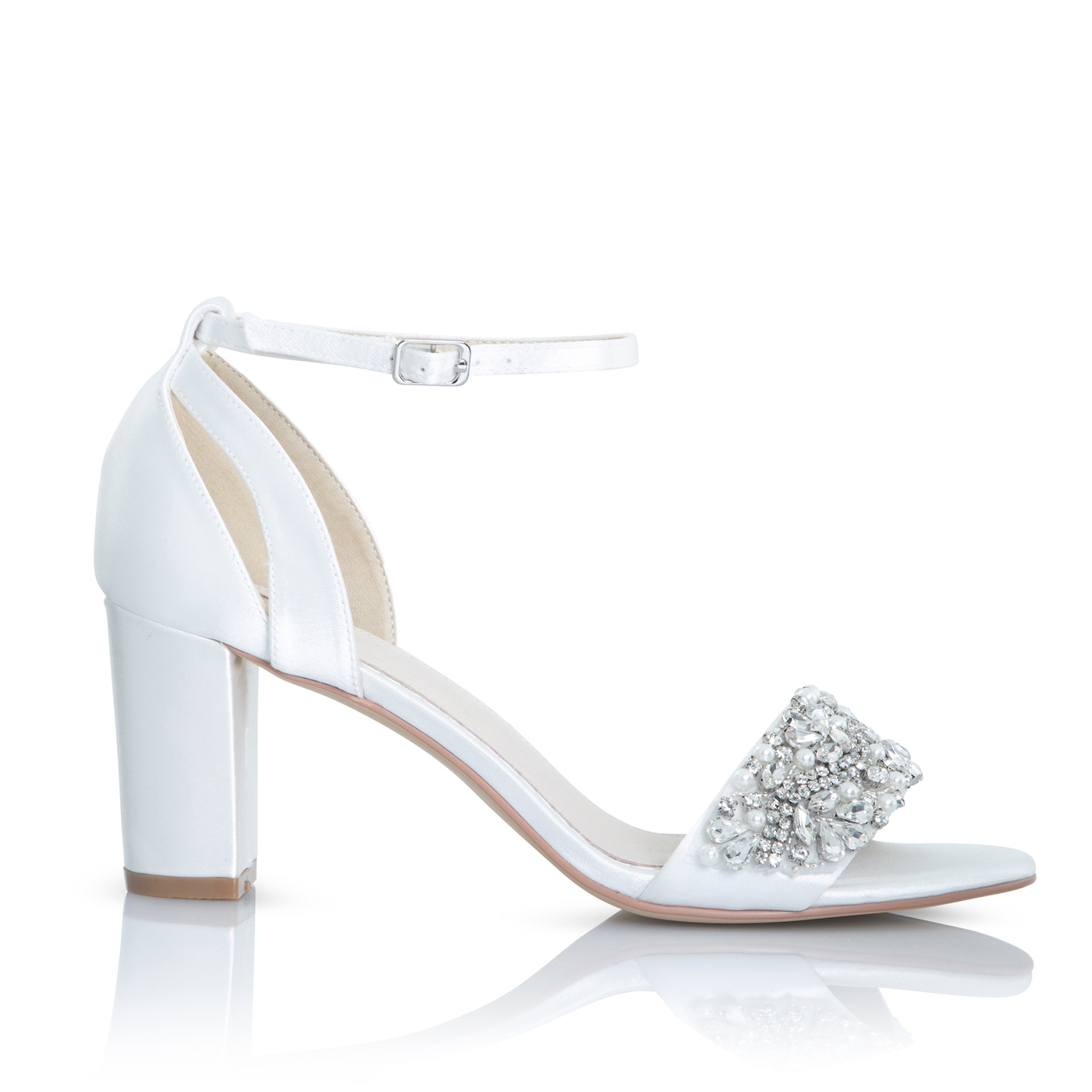 Alexa ist eine wunderschöne Brautsandale mit Blockabsatz. Ein Hingucker ist die Strassapplikation mit Perlen. Alexa ist sehr bequem und hat einen Knöchelriemen. Absatzhöhe 70 mm.