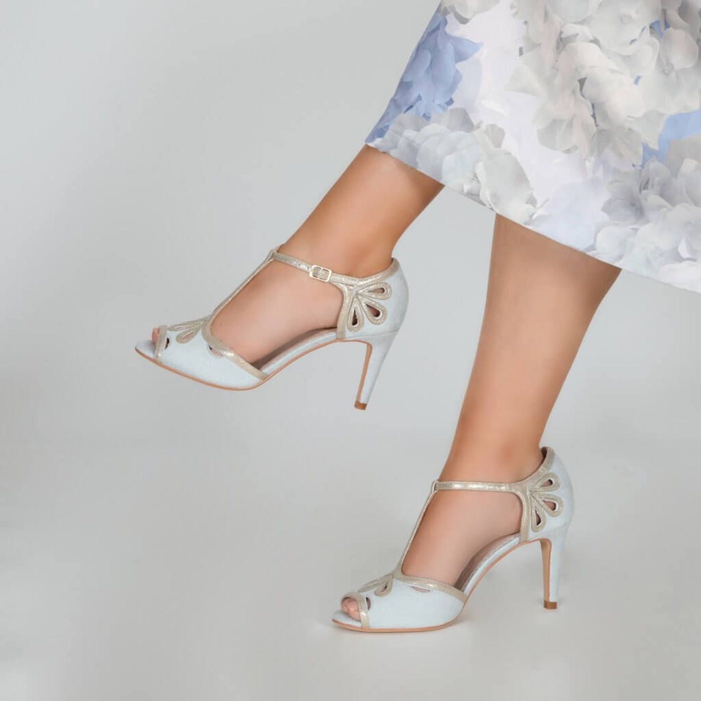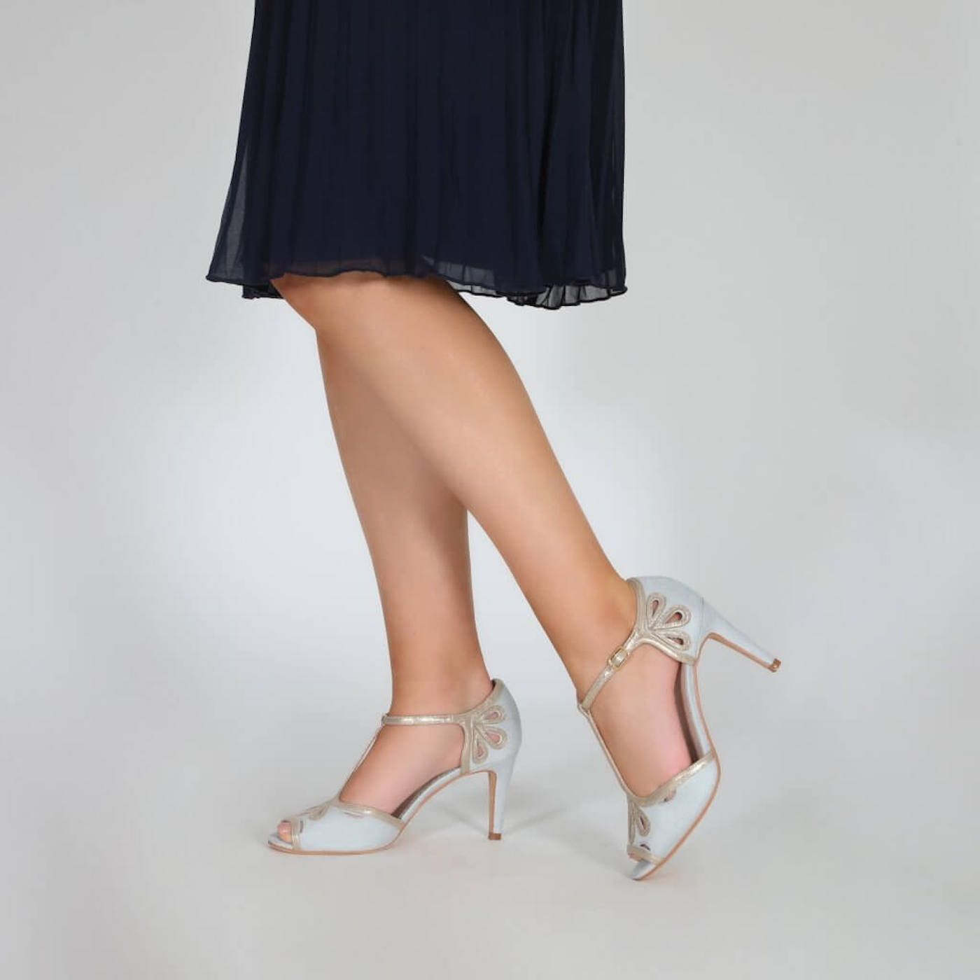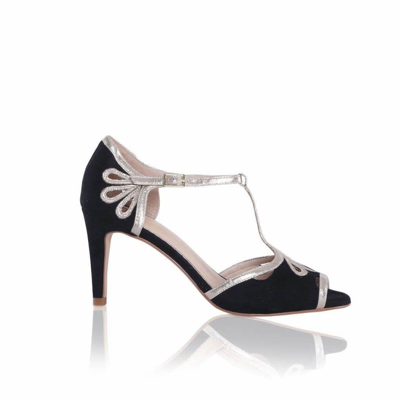 Esme ist nicht nur ein wunderschöner Brautschuh im Vintage-Style, sondern auch ein Hingucker als Alltags- oder Abendschuh. Der Schuh ist aus Wildleder mit schimmernden, glamourösen Gold-Metallic-Einfassungen, T-Riemen, im Innenbereich weich gepolstert. Absatzhöhe 82 mm.