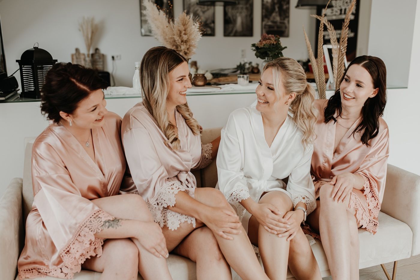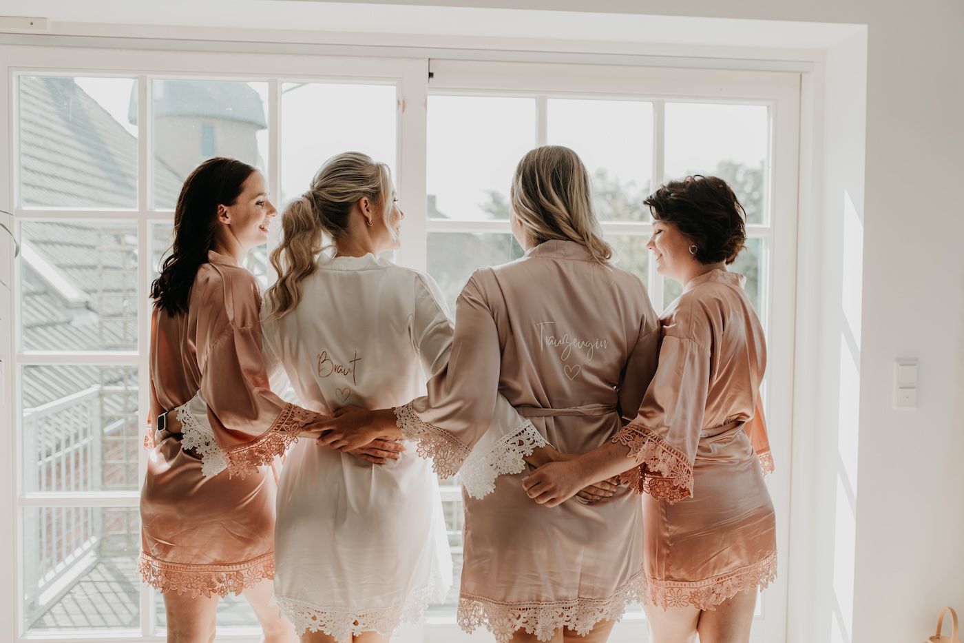 Ideal für entspannte Momente beim Getting Ready oder als stilvolle Überraschung für die Braut und ihre Brautjungfern. Perfekt für tolle Fotos und einen glamourösen Start in den Hochzeitstag. Verleiht den Morgenmänteln eine persönliche Note mit euren Namen, Initialien oder speziellen Botschaften.