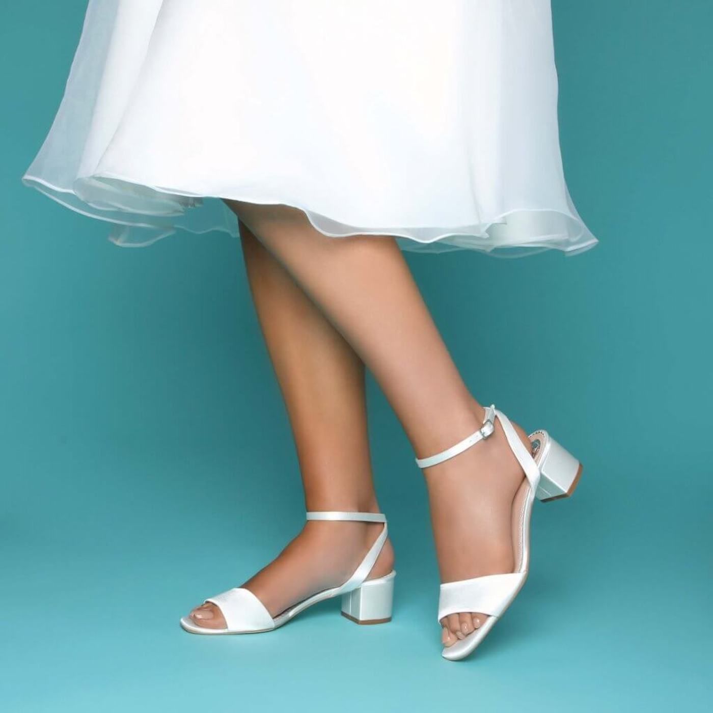 Riley ist eine klassische, bequeme Brautsandale mit einem Blockabsatz und Knöchelriemen. Absatzhöhe 52 mm. Der Schuh ist färbbar.