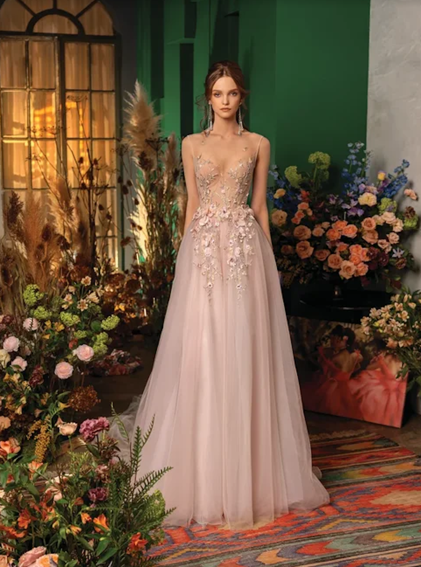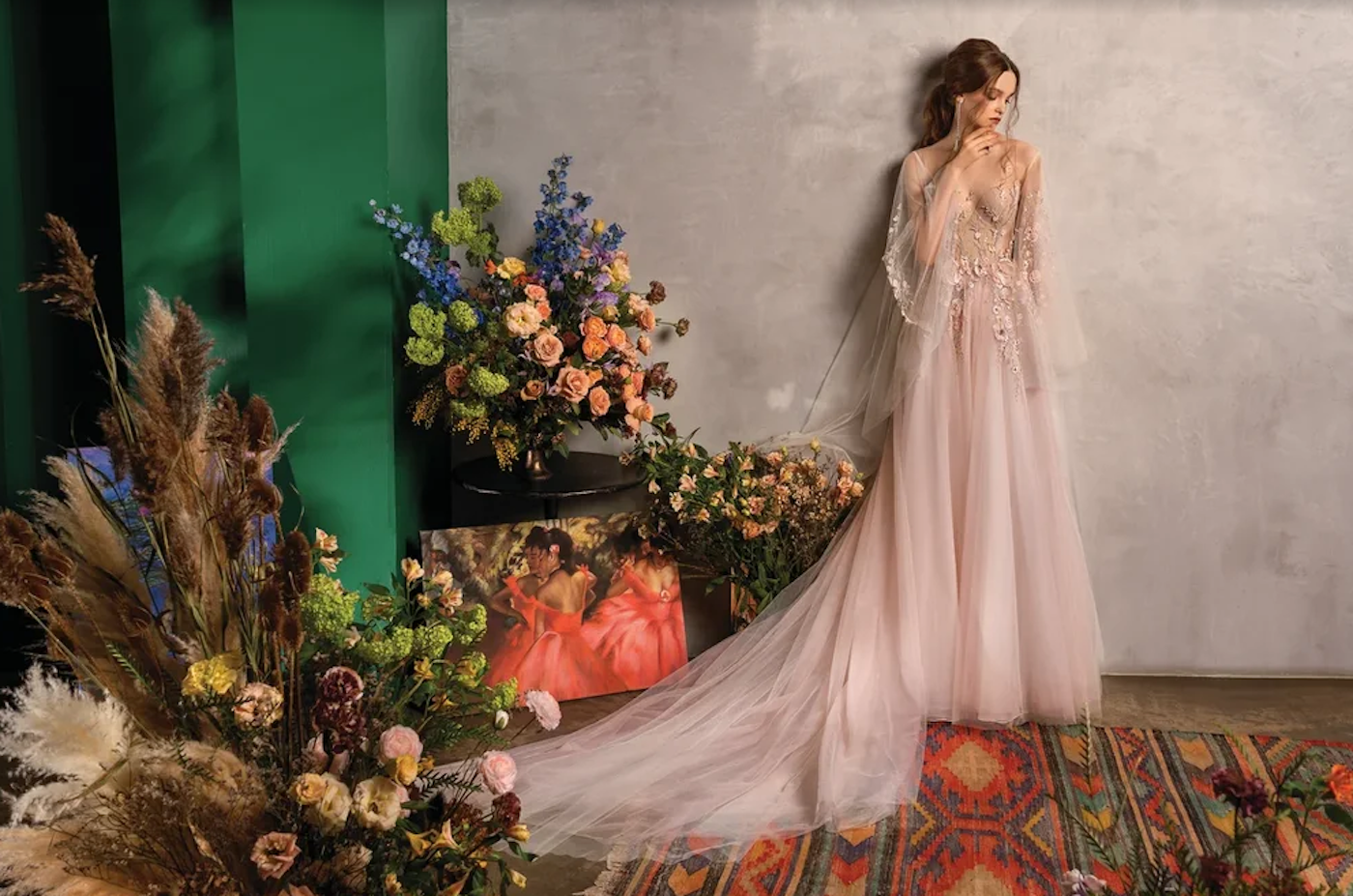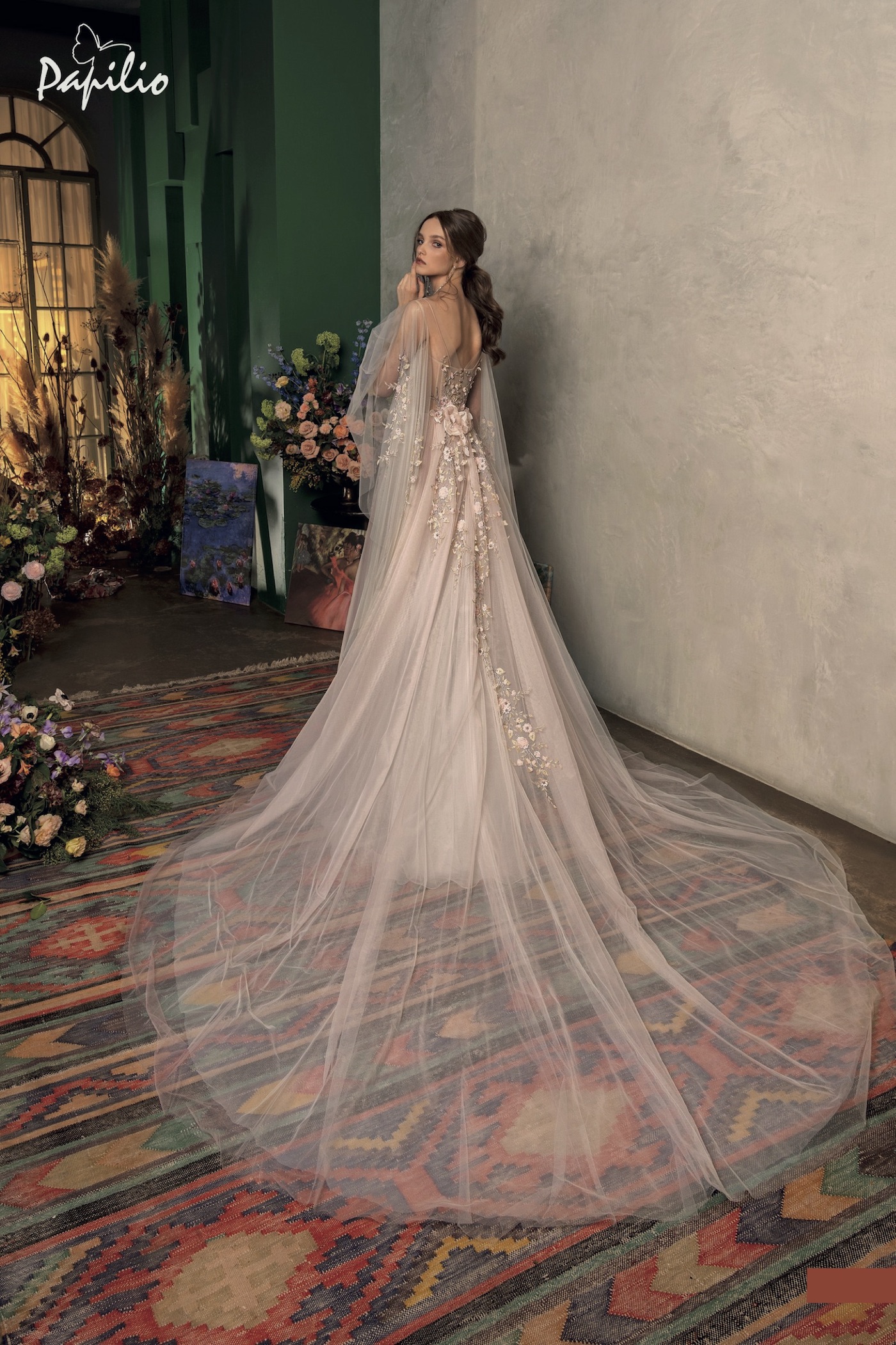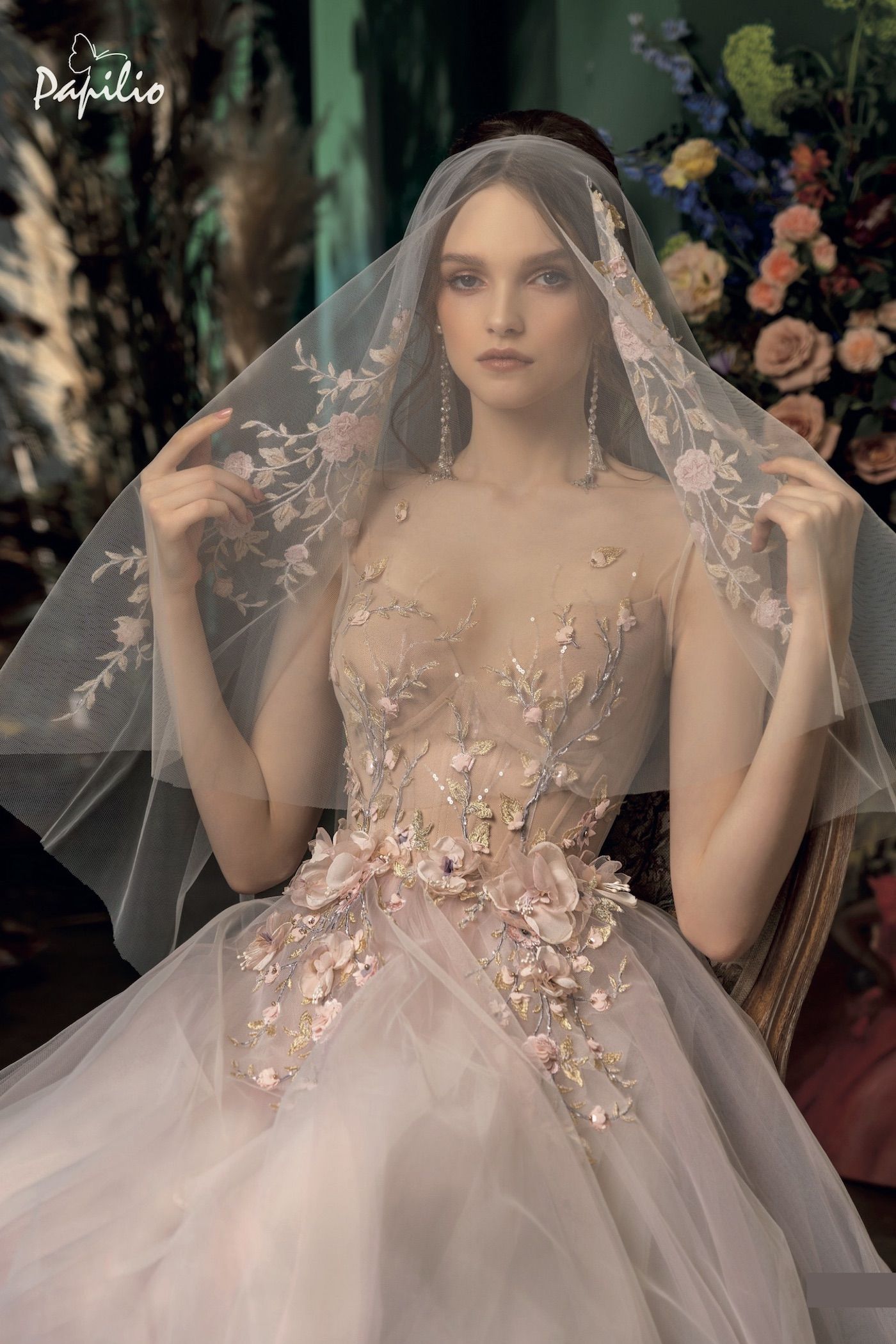 Ein zauberhaftes Prinzessinnen Kleid für die Experimentalistin. Der Hingucker sind die weiten Fledermausärmel aus Tüll mit den von Hand aufgenähten großen bunten 3D Blumen. Diese bunten 3D Blumen verzieren auch liebevoll das Oberteil und laufen großzügig in den Rock. Der Tüllrock hat eine lange Schleppe. Corsage
