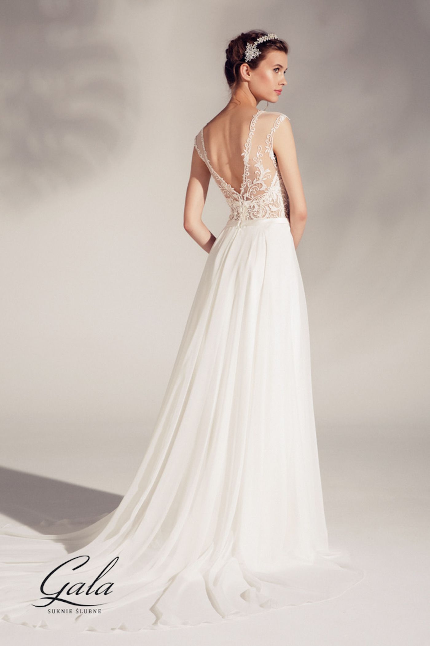 Ein klassisches Brautkleid mit einem weich fließenden Chiffonrock. Das Oberteil besticht durch seine transparenz und ist liebevoll mit Spitze verziert. Das Kleid hat eine Corsage und der Gürtel eine Strassapplikation.