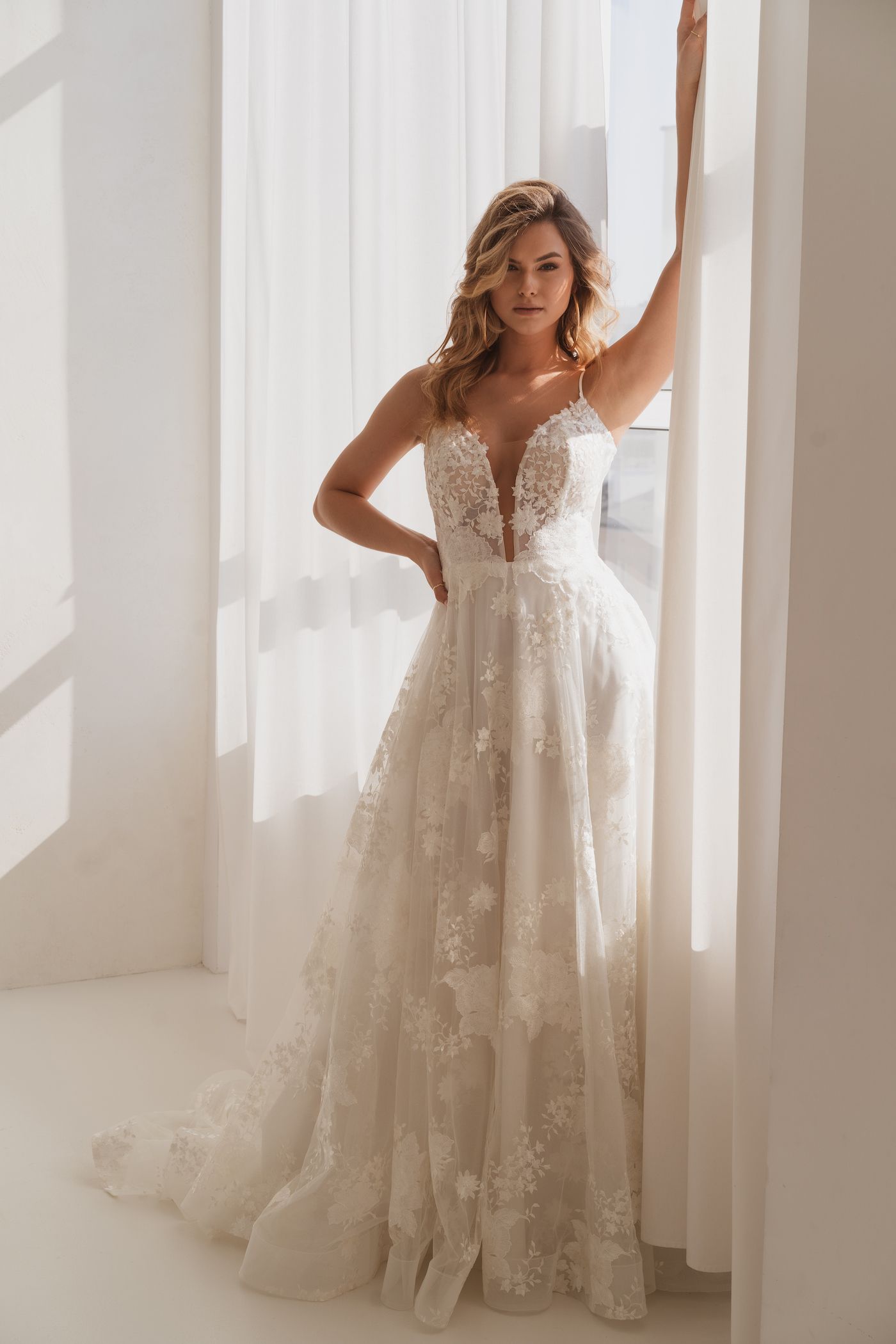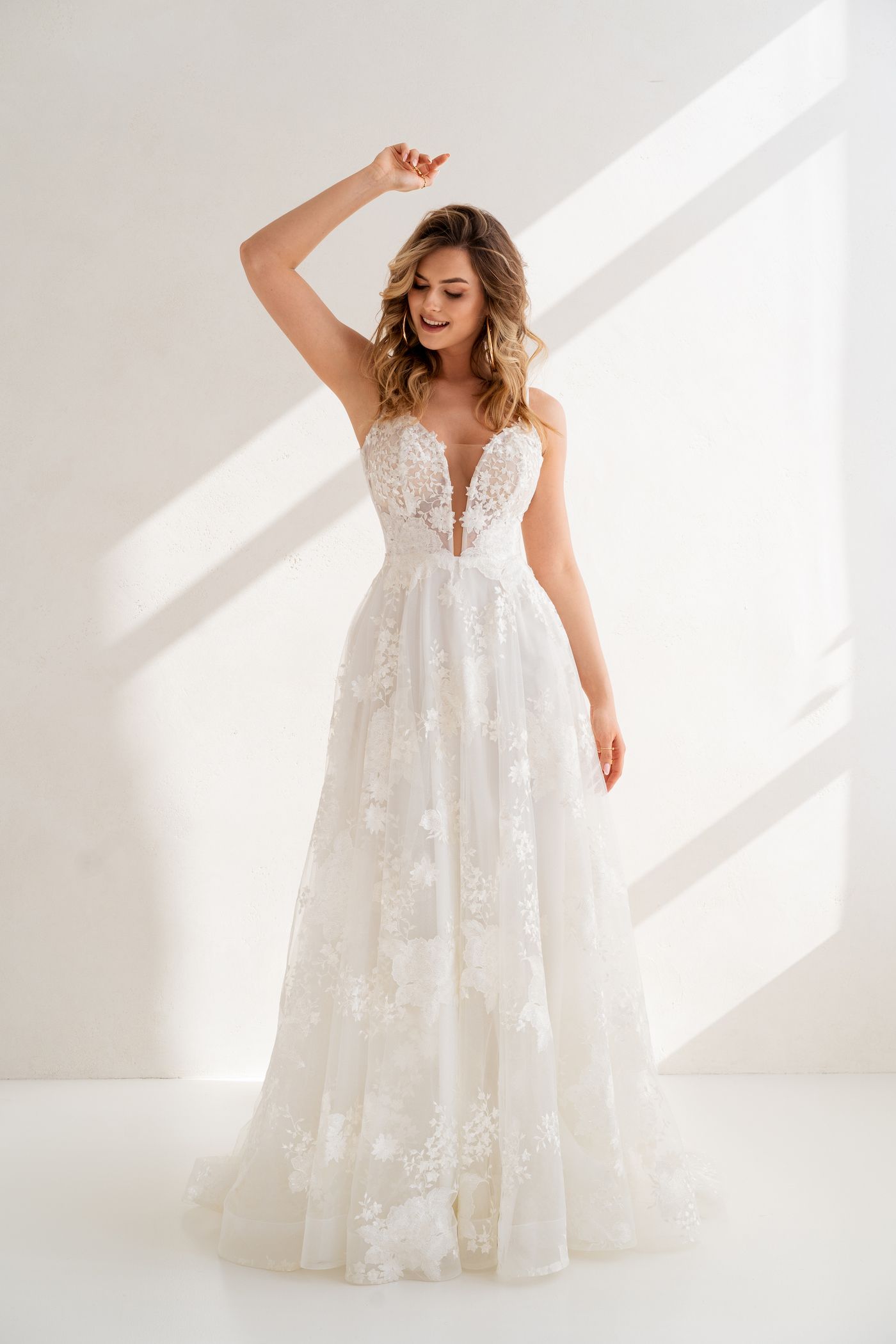 Unser absoluter Hingucker ist Ashley. Dieses Brautkleid besteht komplett aus einer wunderschönen floralen Spitze und hat eine lange Schleppe. Das Oberteil hat vorne und hinten einen V-Ausschnitt und Spaghettiträger. Besonders sexy ist der tiefe V-Ausschnitt im Vorderteil. Der Rock ist aus einer Tüllspitze die leicht glitzert. Wir lieben Ashley ...