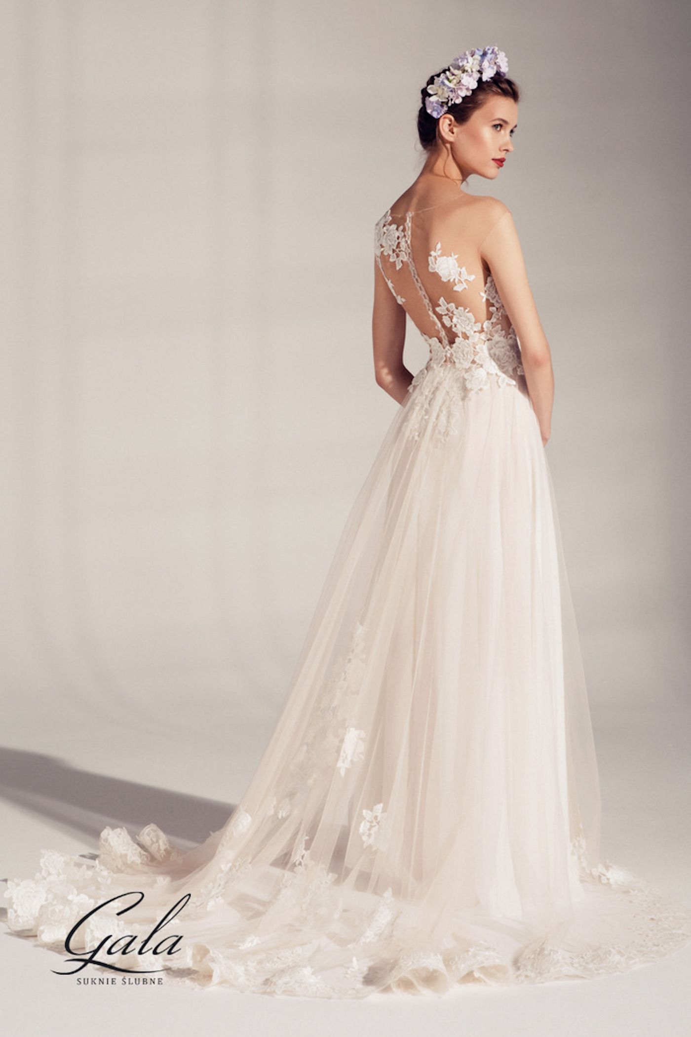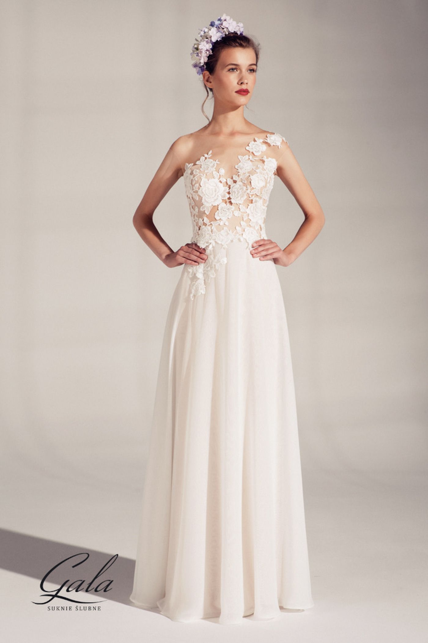 Ein sehr extravagantes Brautkleid aus zart fließendem Chiffon. Die Spitze ist aus großen Rosenmotiven und das Oberteil hat einen asymmetrischen transparenten Verlauf. Der Rücken ist mit facettierten Kristallknöpfen besetzt. Zu dem Kleid gibt es einen traumhaften Rocküberwurf, der an der Taille gehalten wird und der eine lange Schleppe mit passender Spitzenkante hat. Der Rocküberwurf ist abnehmbar.