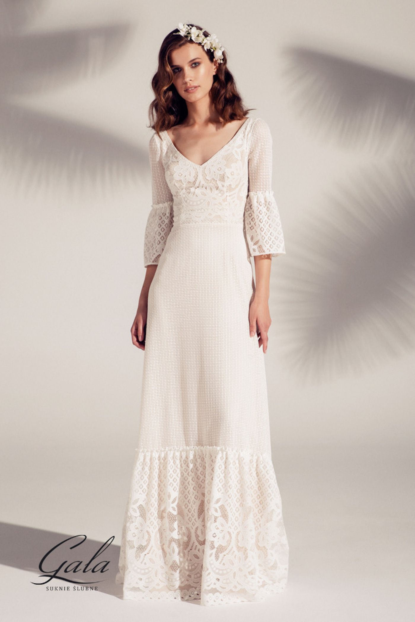 Ein wunderschönes Bohobrautkleid aus geometrischer und floraler Spitze. Perfekt für eine Scheunenhochzeit oder am Strand. Rüschen am Rock und an den Ärmeln sorgen für einen romatischen Look. V-Ausschnitt im Vorder- und Rückenteil. Der Rock hat eine leichte Schleppe.