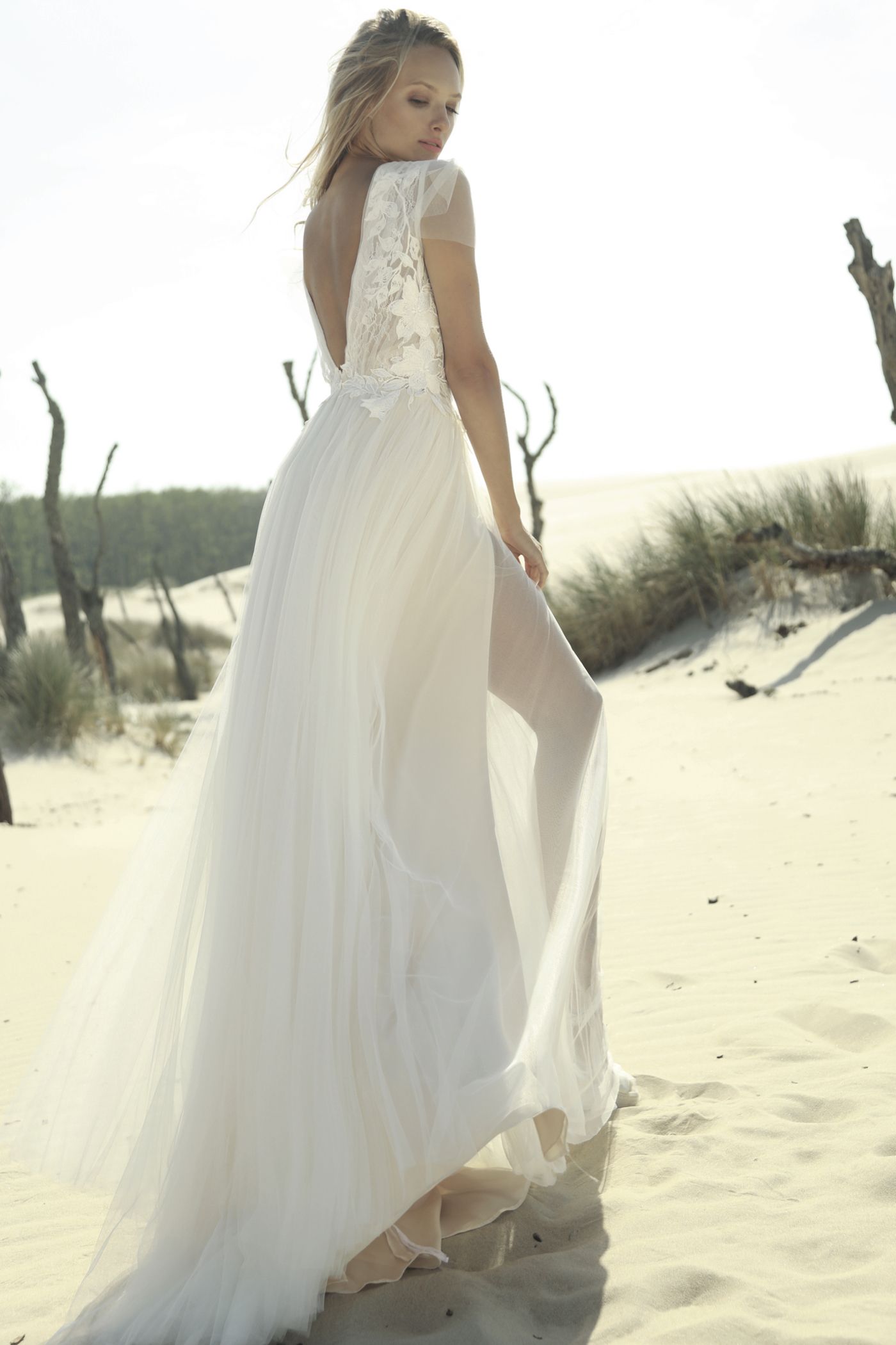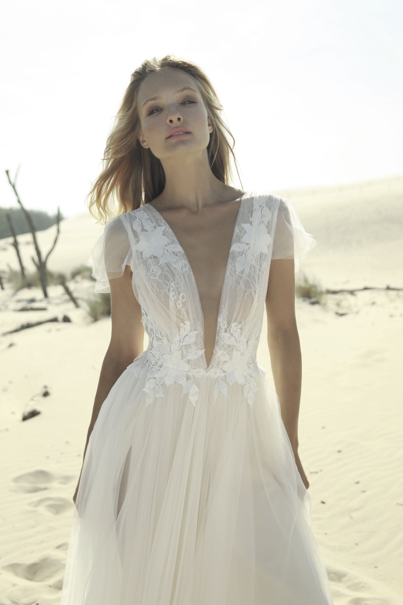 Eigenschaften: Boho-Stil, Drapierungen, Blüten-Applikationen, angeschnittene Tüll-Ärmel, V-Ausschnitt, Tüll-Rock, mit Schleppe.