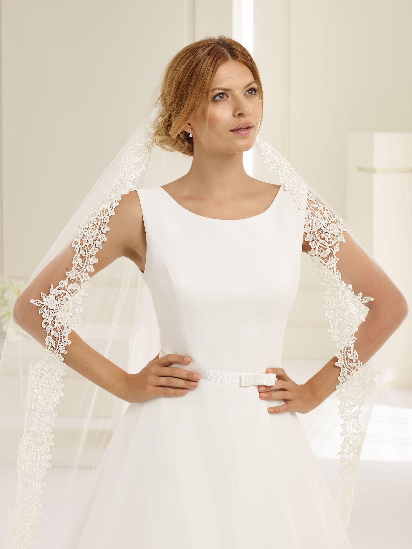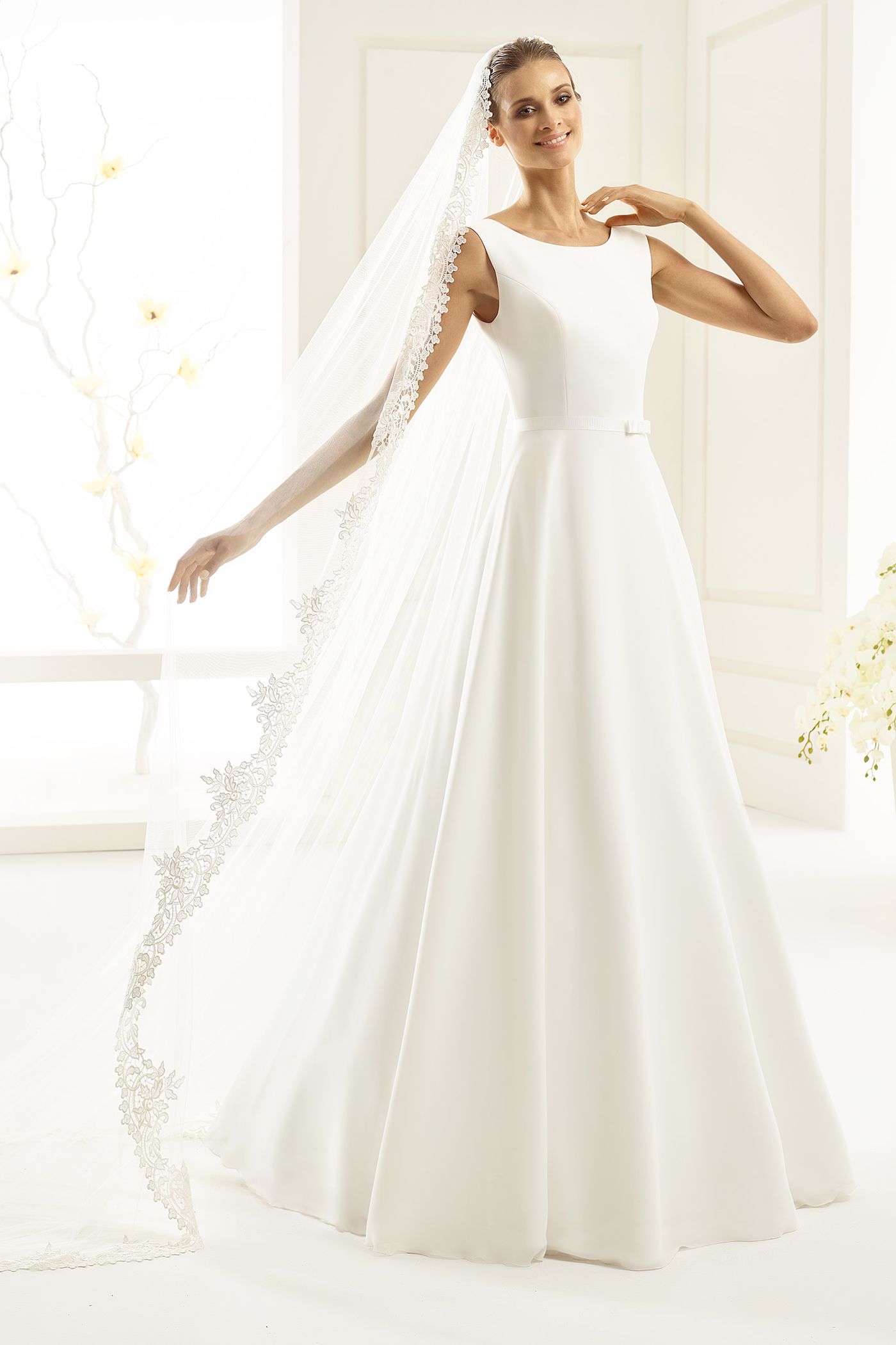 A-Linien Brautkleid aus hochwertigem Chiffon mit U-Boot-Ausschnitt und tiefen Rückendekolleté. Feiner Gürtel mit Zierschleife und verdeckter Reißverschluss hinten. Das Brautkleid kann mit oder ohne Reifrock getragen werden.