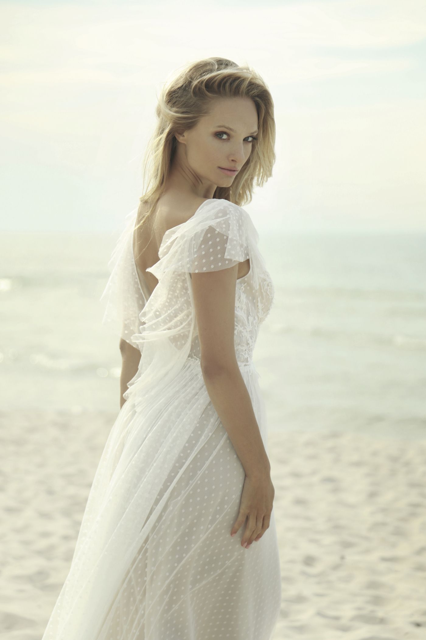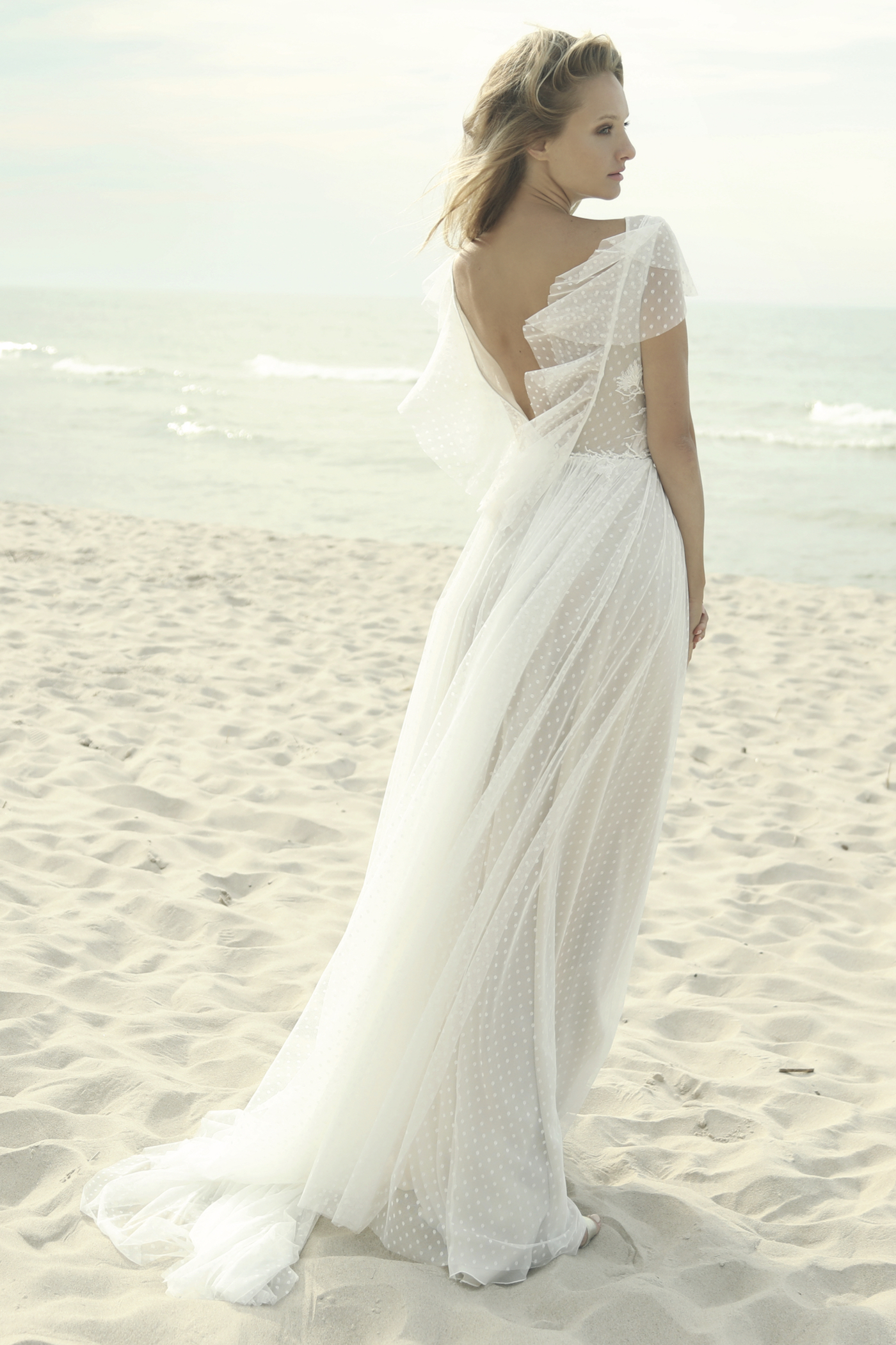 Originelles Kleid im Vintage-Stil. Der Pünktchen-Tüll mit Spitzenapplikationen verleiht ein mädchenhaftes und frisches Aussehen. Eine besondere Zierde ist der Rückenausschnitt mit verspielten Rüschen. Der leichte Rock schmiegt sich weich an die Silhouette und geht in eine dezente Schleppe über.