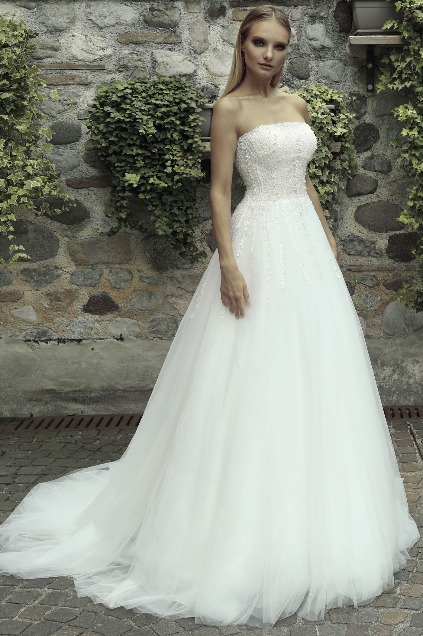 Klassisches Brautkleid. Das Corsagen-Oberteil mit geradem-Ausschnitt wird mit vielen Kristall- und Perlenketten bestickt. Der weite Rock mit einer Schleppe besteht aus mehreren Lagen Tüll. Die Kristall- und Perlenketten laufen in den Rock über.