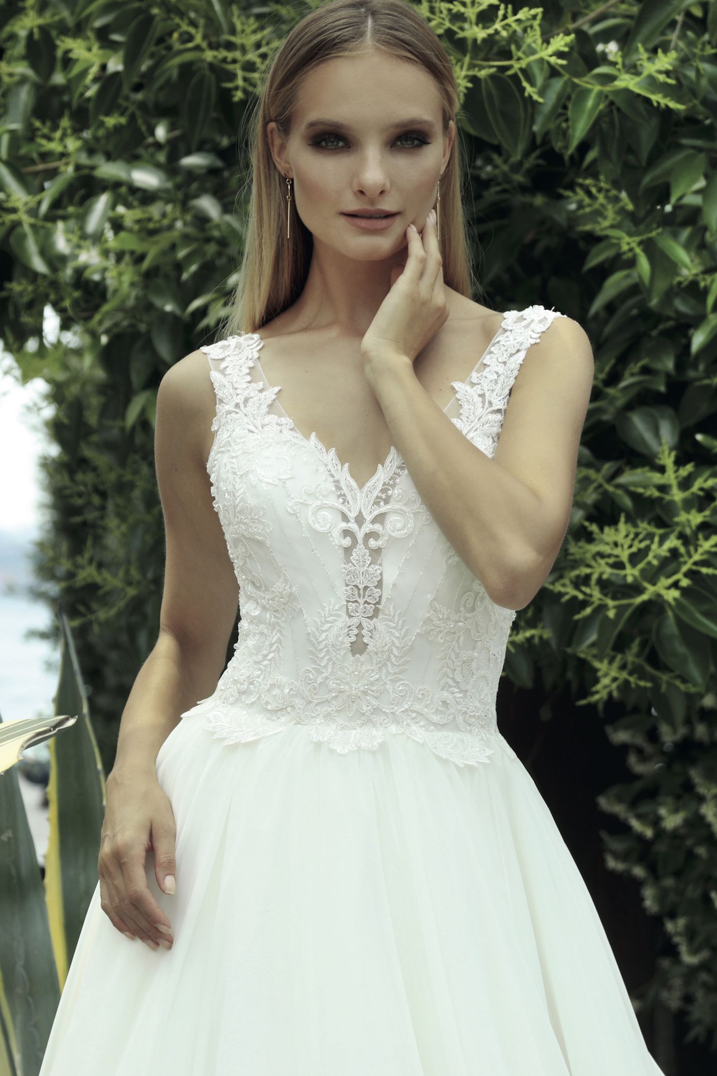 Chiffon-Kleid mit Schleppe geschmückt mit einer Pailletten bestickten Spitze. Der V-Ausschnitt verlängert optisch die Silhouette und gleicht den voluminösen Rock aus. Träger mit Spitze verziert verleihen halt.
