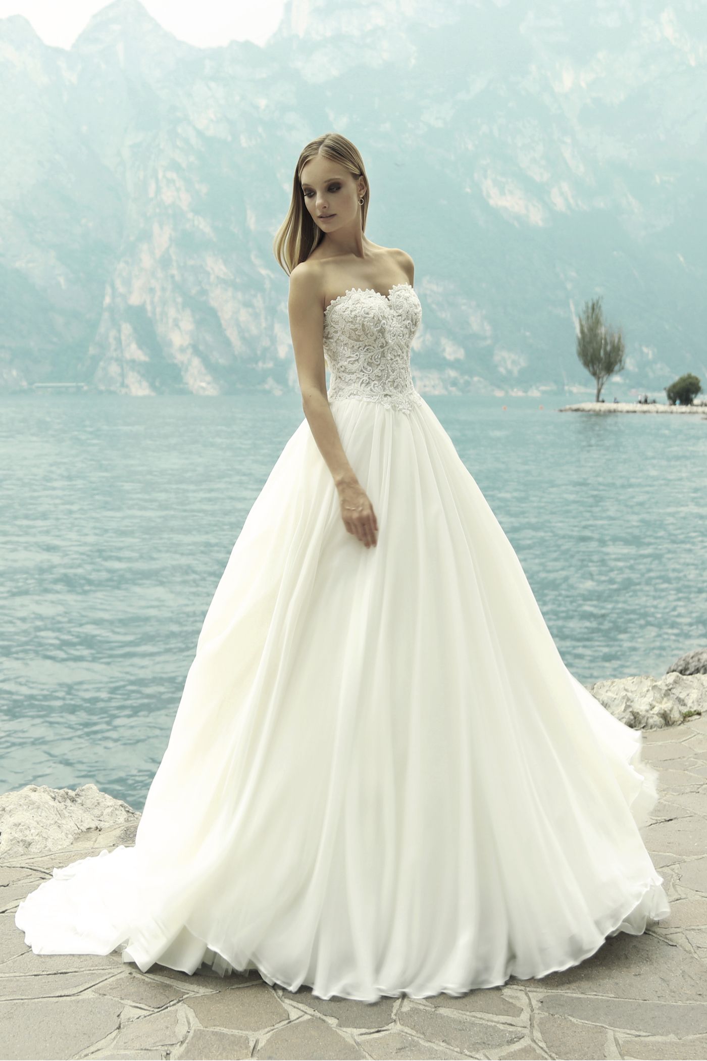 Klassisches Brautkleid. Das Corsagen-Oberteil mit Herz-Ausschnitt wird mit Tausenden von Perlen bestickt. Der weite Rock mit einer Schleppe besteht aus Chiffon.