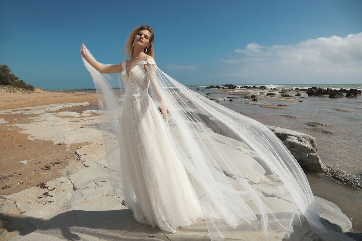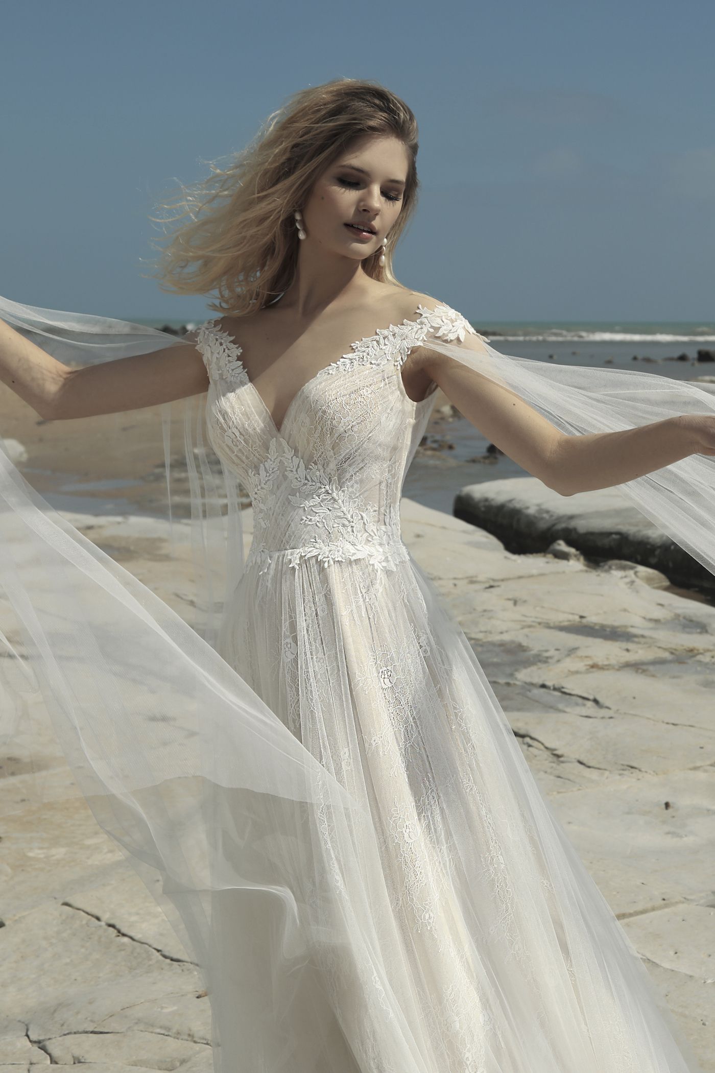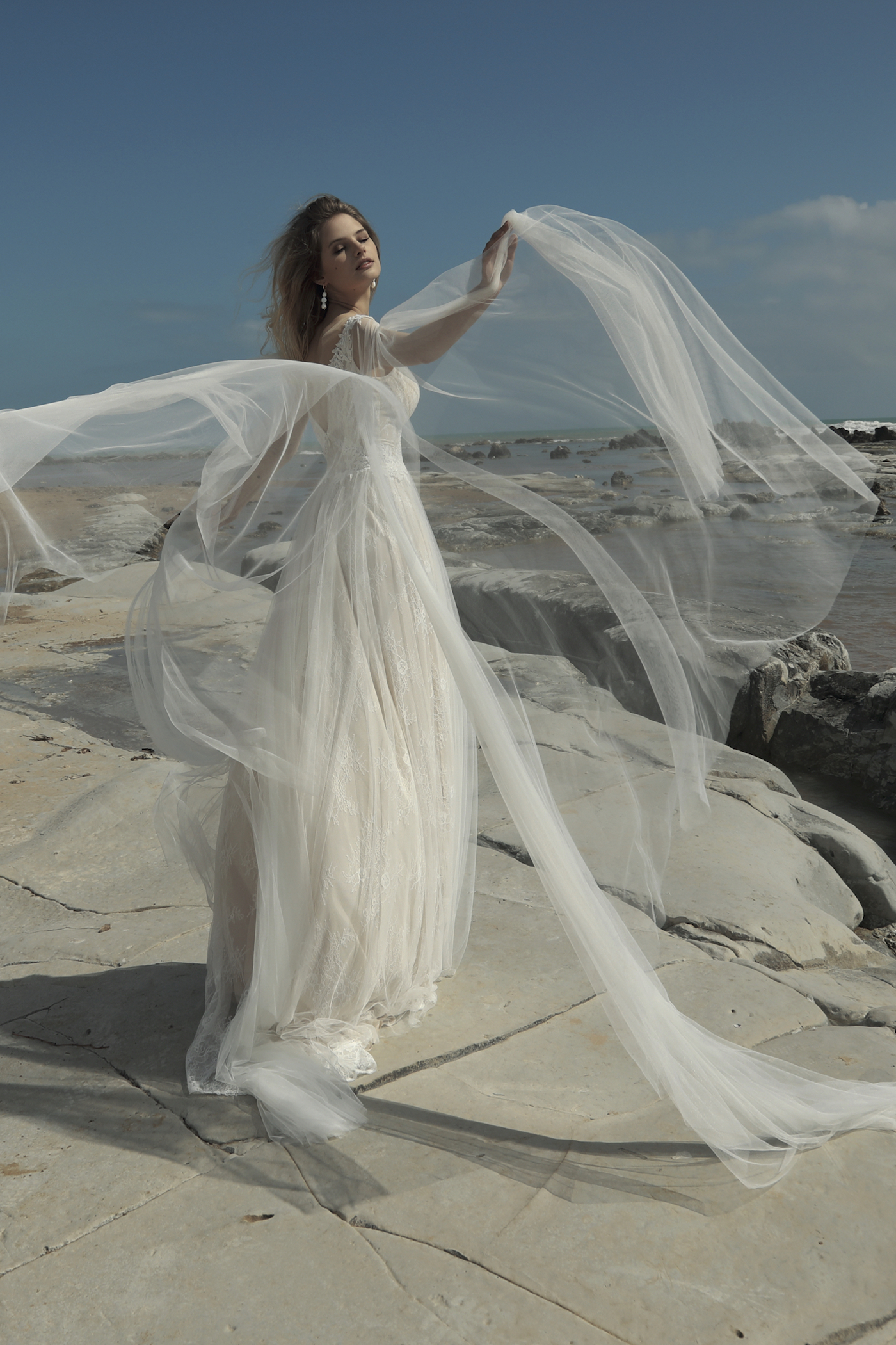 Der große Vorteil dieses Kleides sind wunderschöne abnehmbare Ärmel, die für den Effekt eines Umhangs mit Schleppe sorgen. Das aus anschmiegsamem Tüll, französischer Spitze und perlenbestickter Gipüre gemachte Kleid entzückt mit seiner Feinheit. Der spanische Ausschnitt verleiht diskreten Charme.