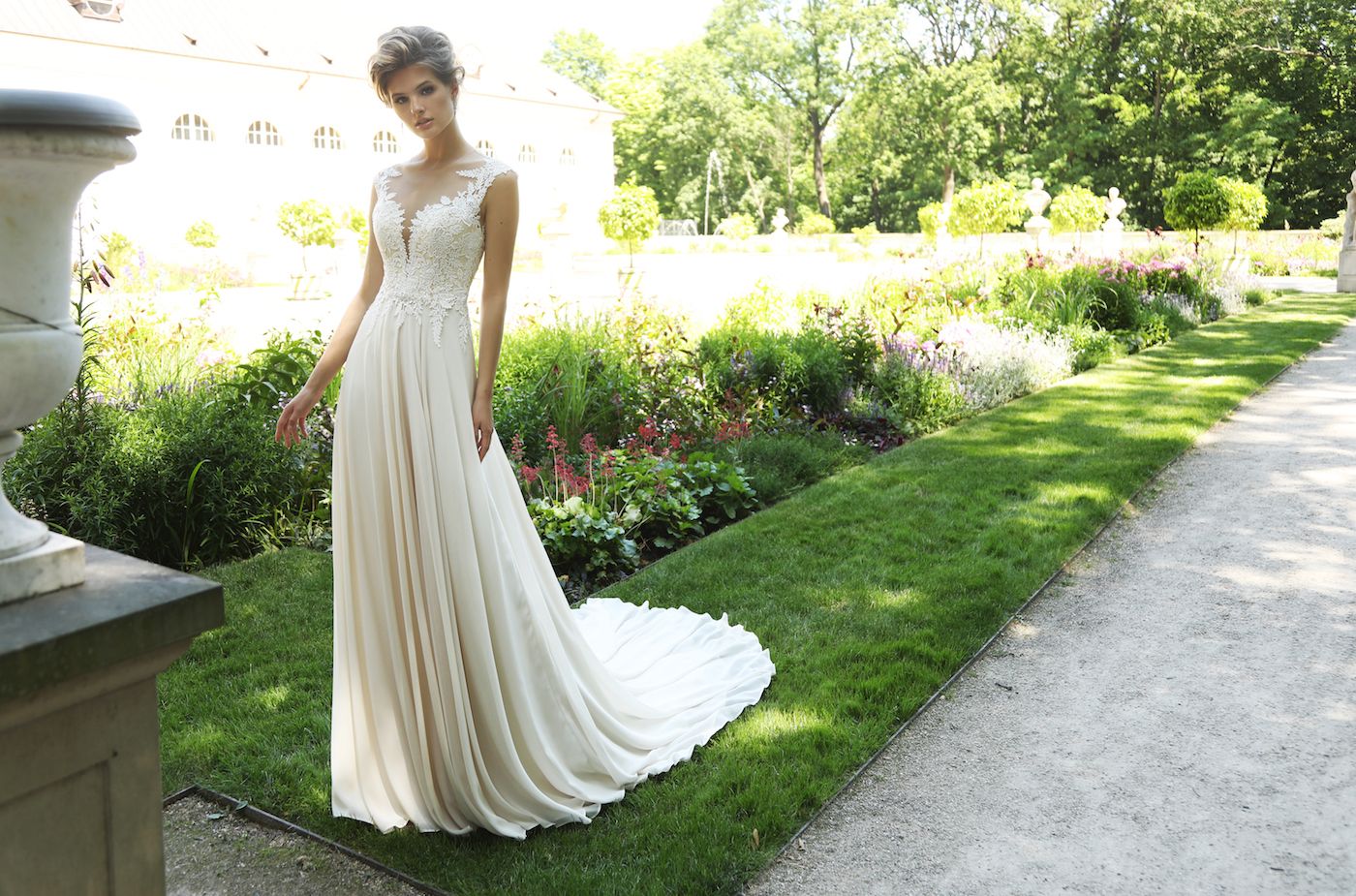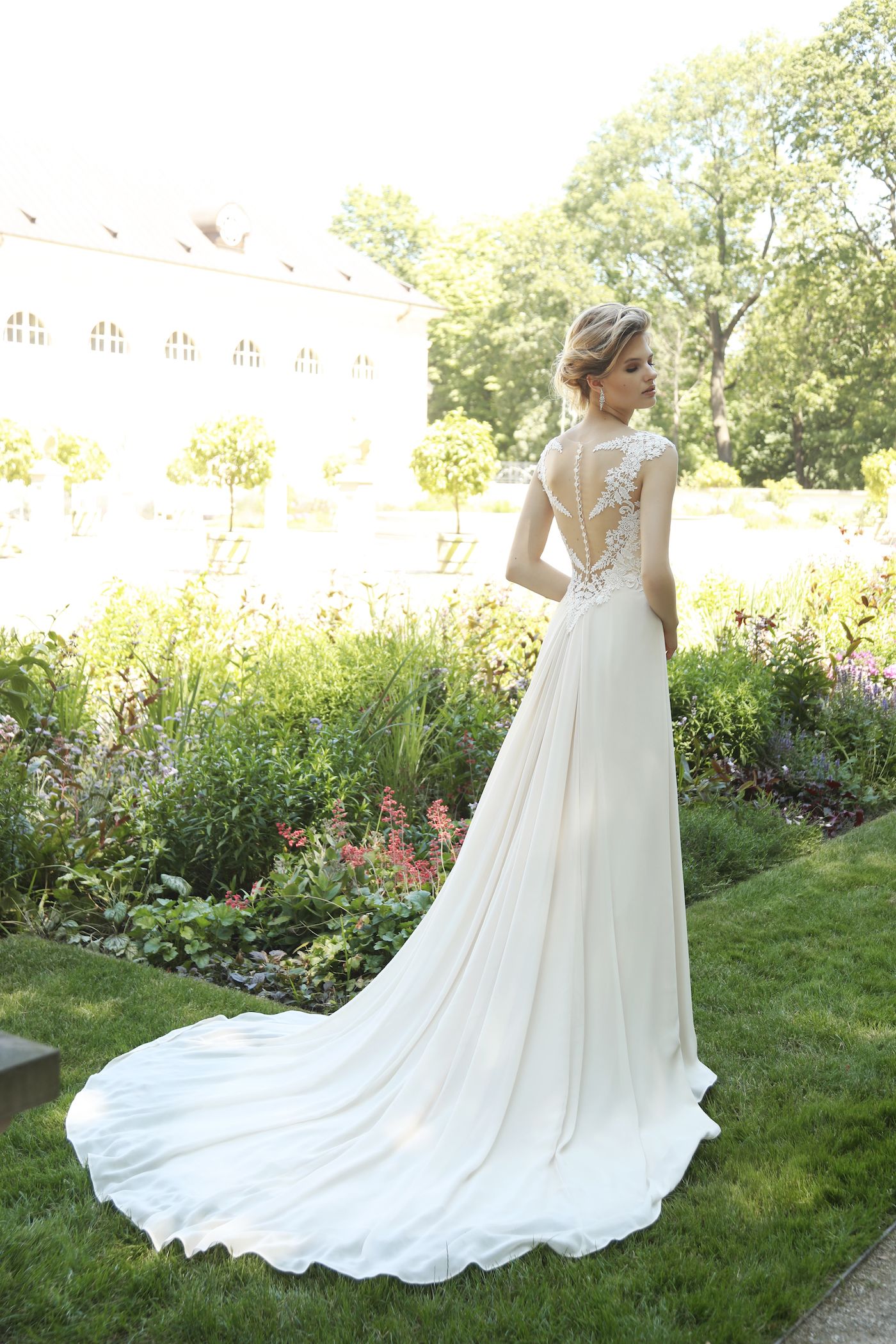 Ein sagenhaftes Kleid mit klassischen Charme. Der feine Rock entzückt mit einer sagenhaften Musselin-Schleppe. Die schön zur Geltung gebrachten Ausschnitte werden mit von Hand angenähten Gipüre-Motiven verziert. Die Taille wurde mit Strass-Schmuck betont.