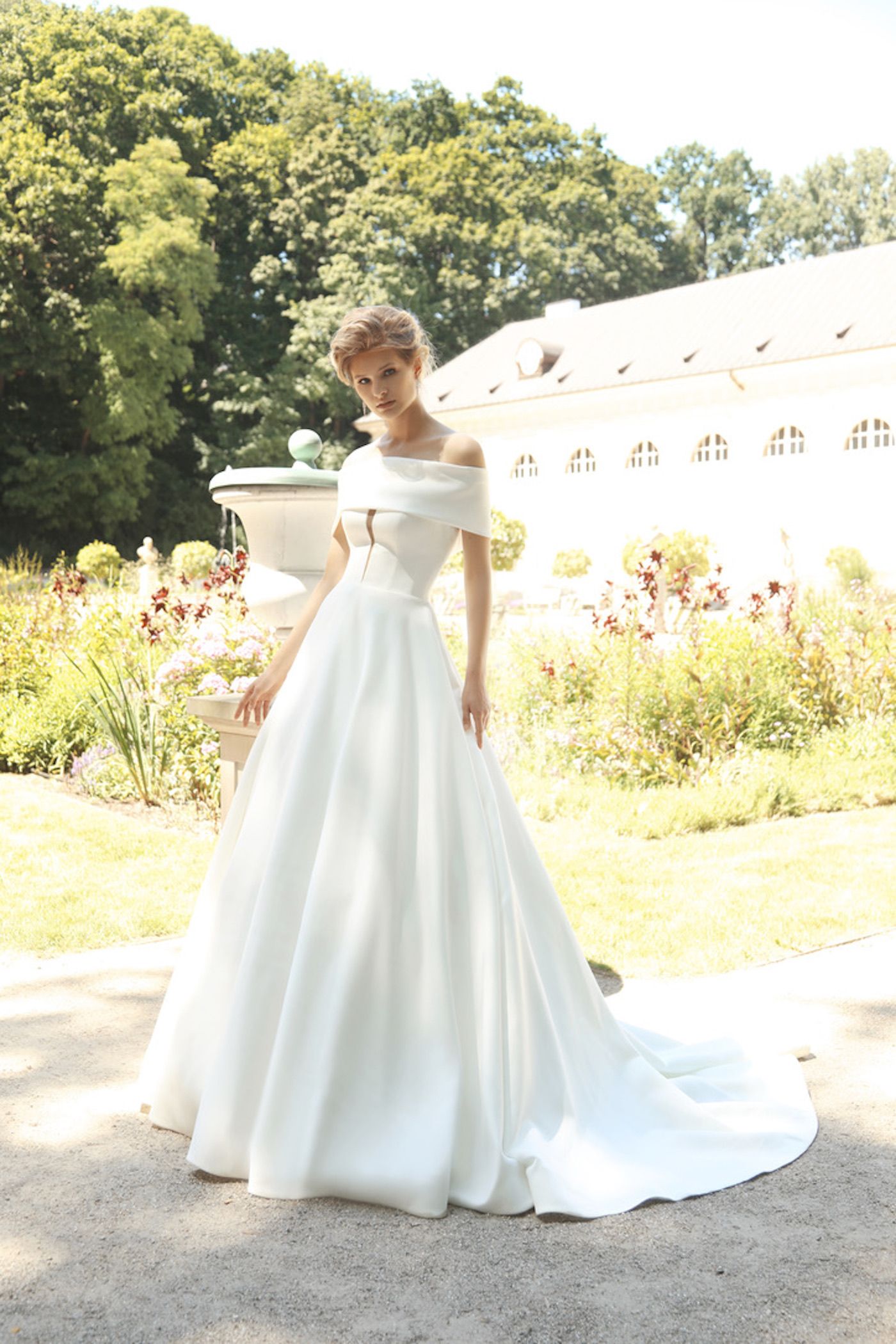 Ein Satin-Prinzessinnen-Kleid mit raffiniertem Schnitt. Der weite Rock mit Schleppe hat einen noblen Charakter. Das Corsagen-Oberteil wird mit interessantem V-Ausschnitt geschmückt. Zu dem Kleid gehört ein Bolero in Form eines breiten Kragens.