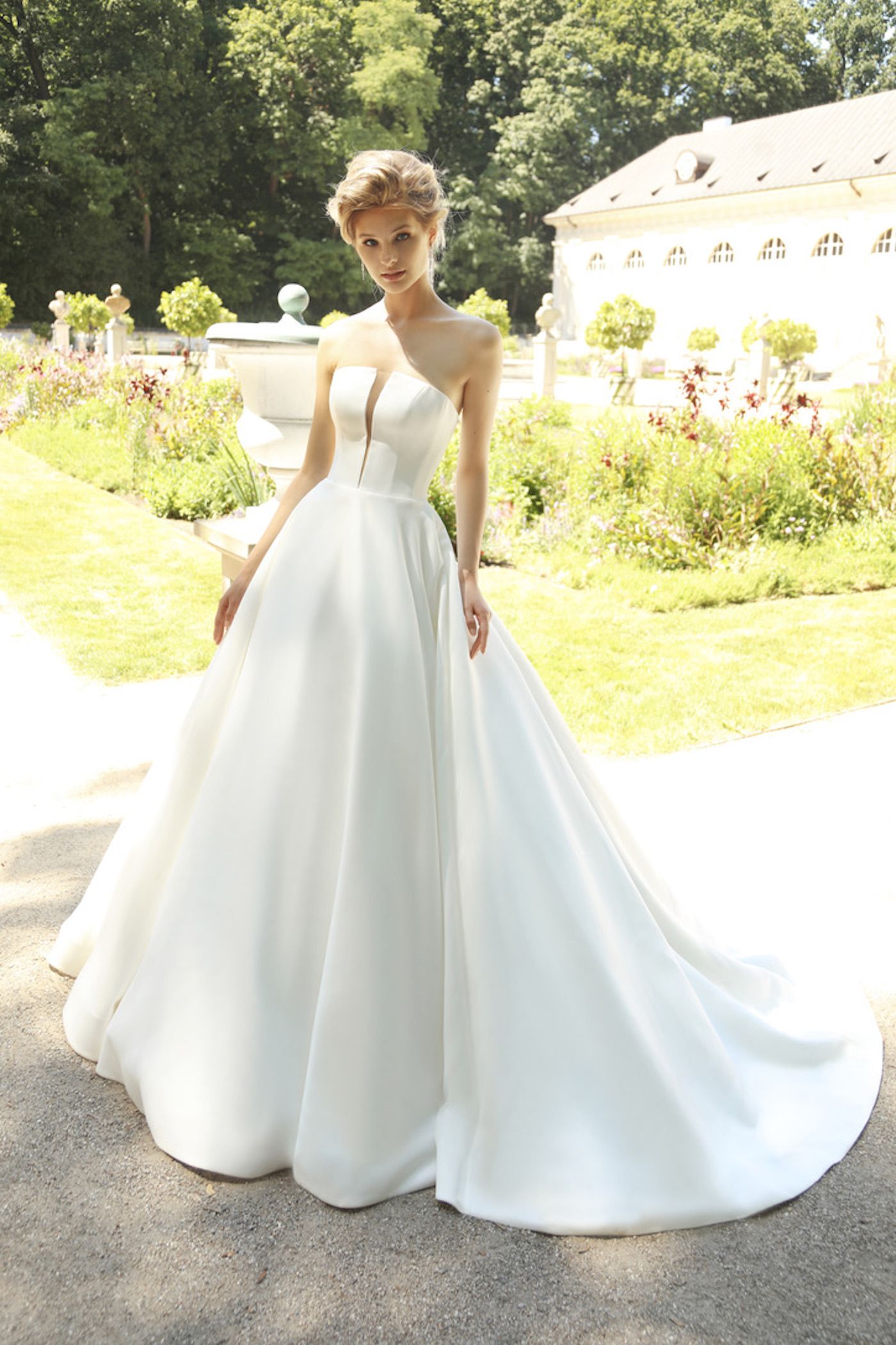 Eigenschaften: Ballkleid, Satin, glatt, mit Schleppe, schulterfrei, ohne Ärmel, V-Ausschnitt