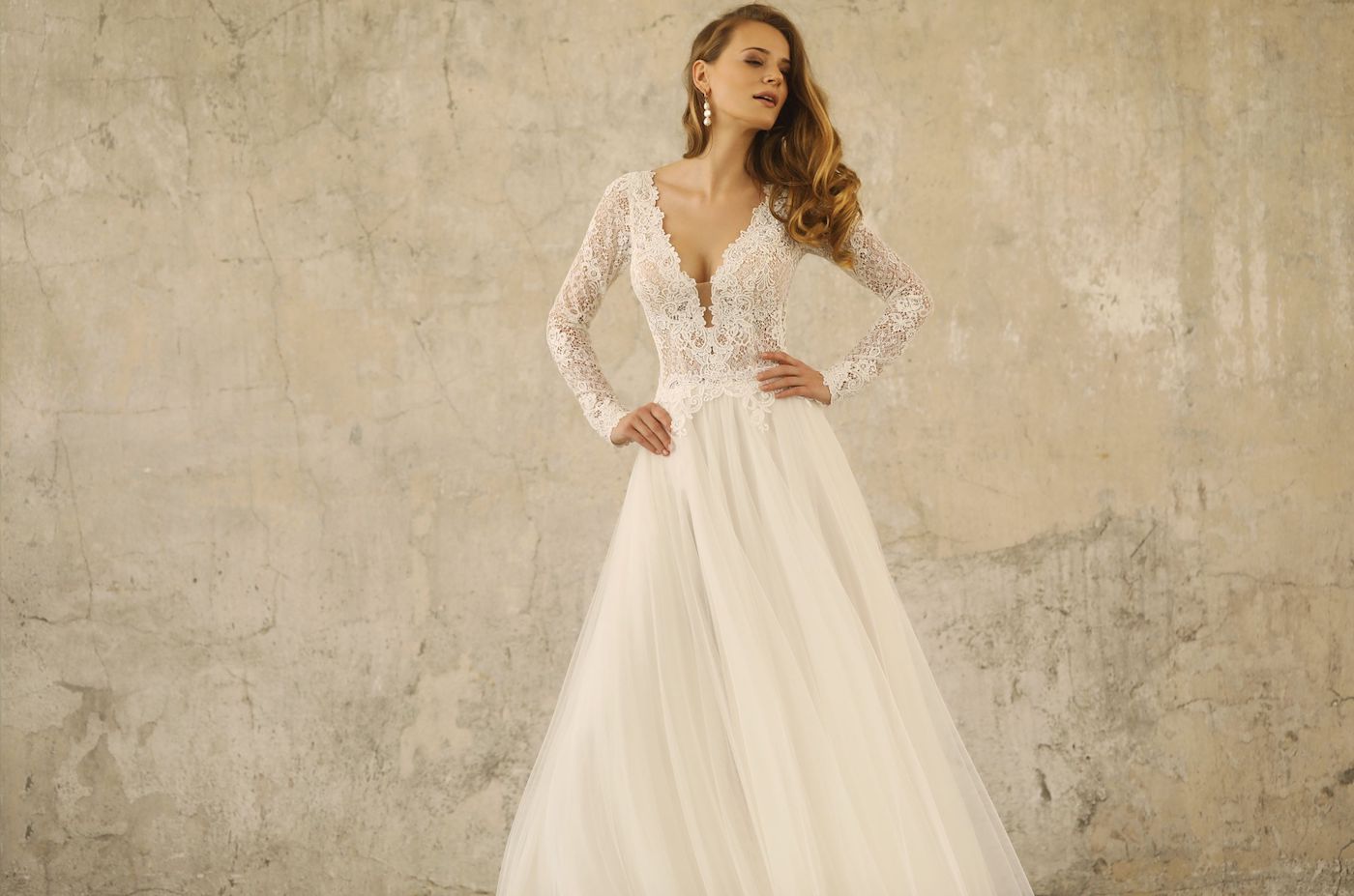 Neu im Atelier. Ein wunderschönes Brautkleid mit einem Rock aus Softtüll mit Schleppe und einer traumhaft weichen Spitze im Oberteil. Lange Arme und V-Ausschnitt.