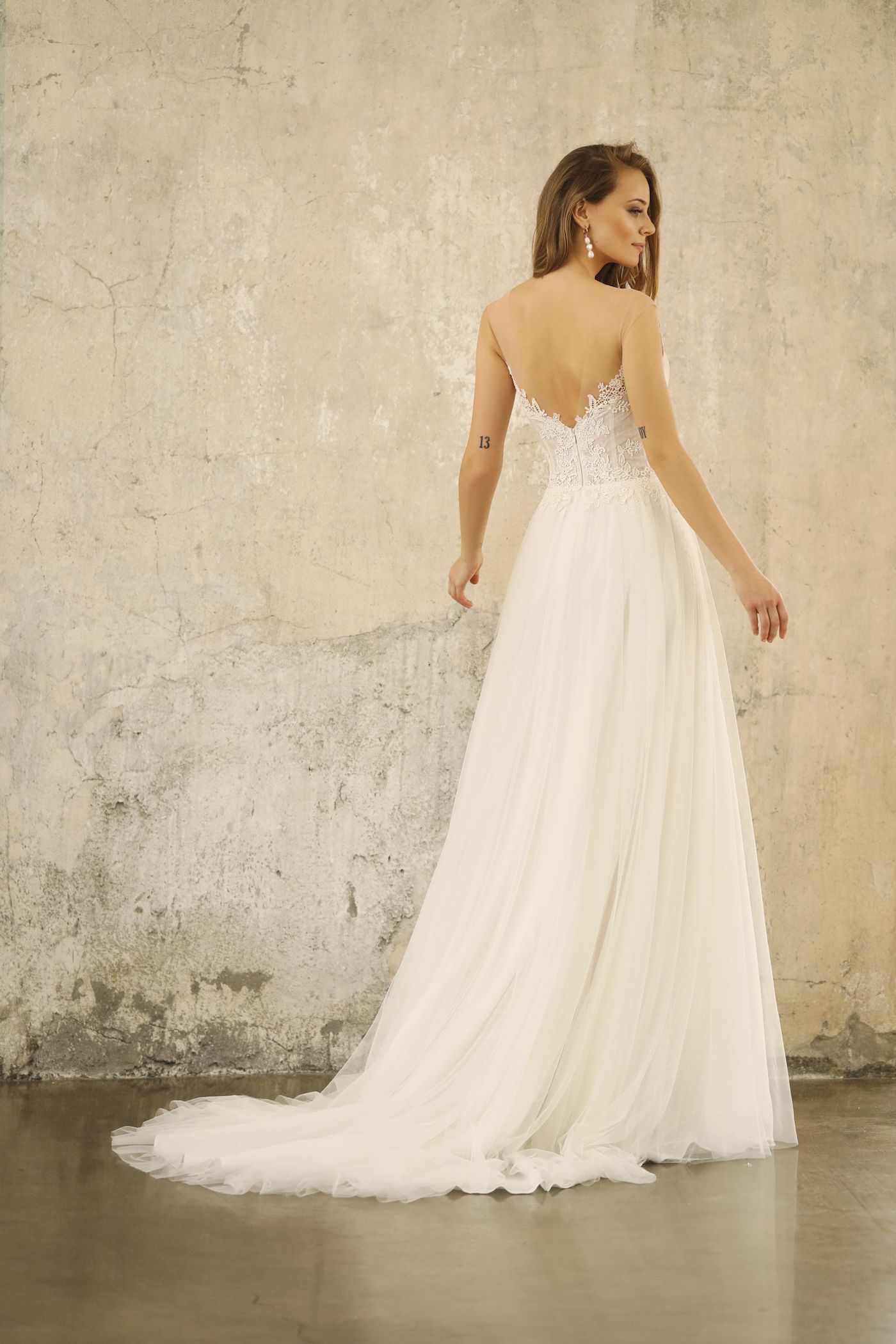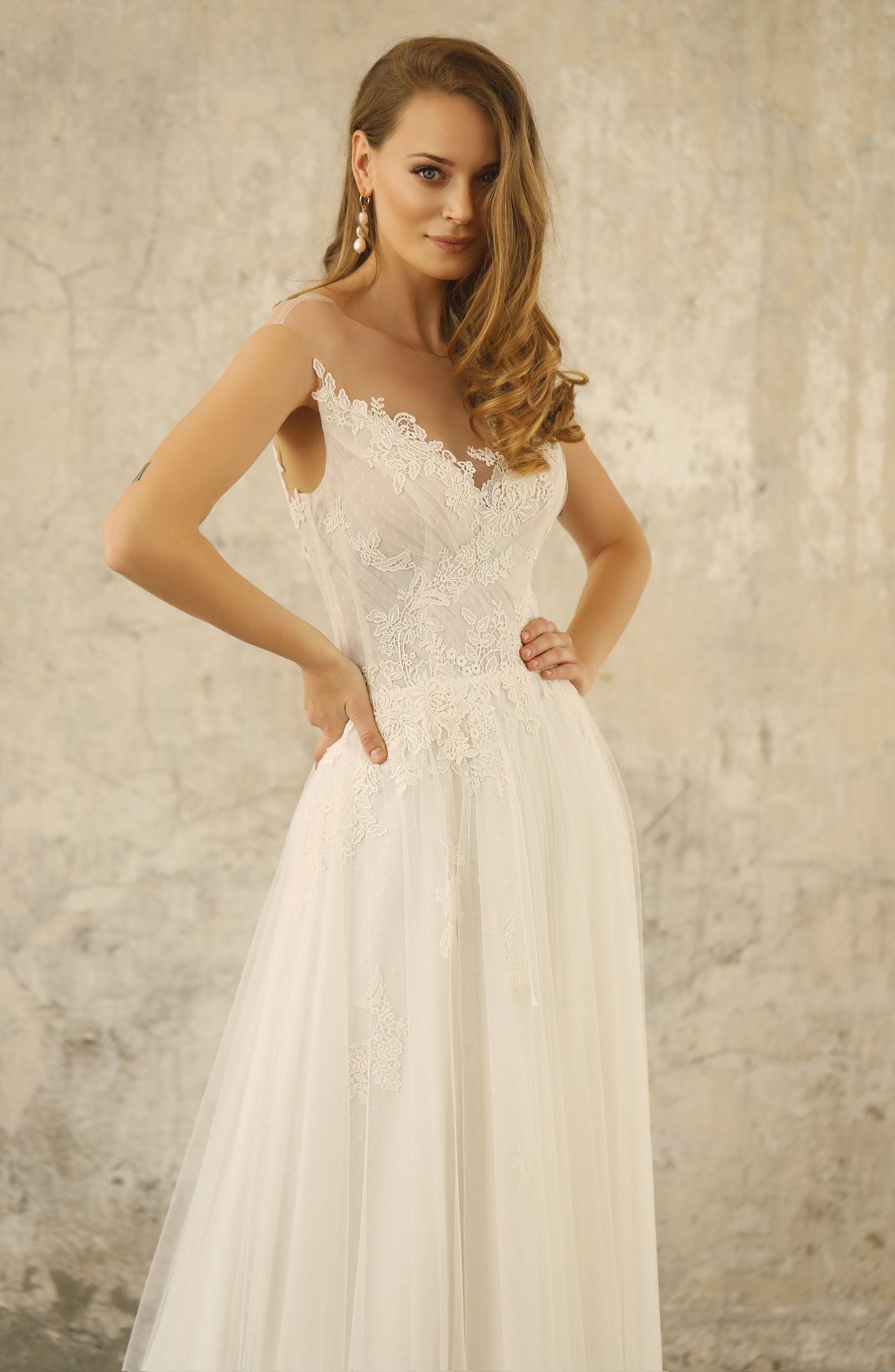 Neu im Atelier. Ein wunderschönes Brautkleid mit einem Rock aus softigen Pünktchentüll mit Schleppe und einer traumhaft weichen Spitze im Oberteil. Ohne Arme. Corsage