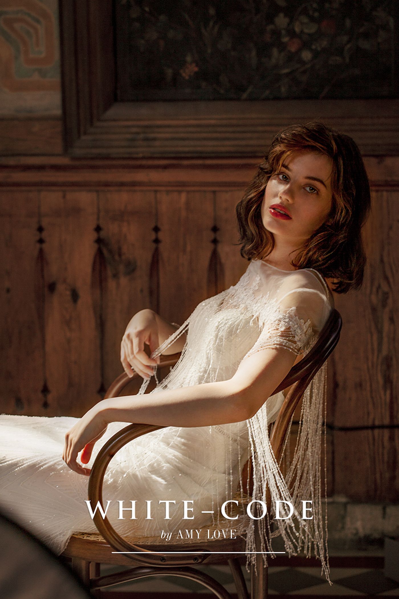 Ein sehr extravagantes Korsagenkleid mit einer geometrisch verlaufenden Spitze im Art Deco Style. Der Rock schmiegt sich raffiniert an die Hüften. Um die Taille verläuft ein zarter Gürtel. Das Cape ist abnehmbar.