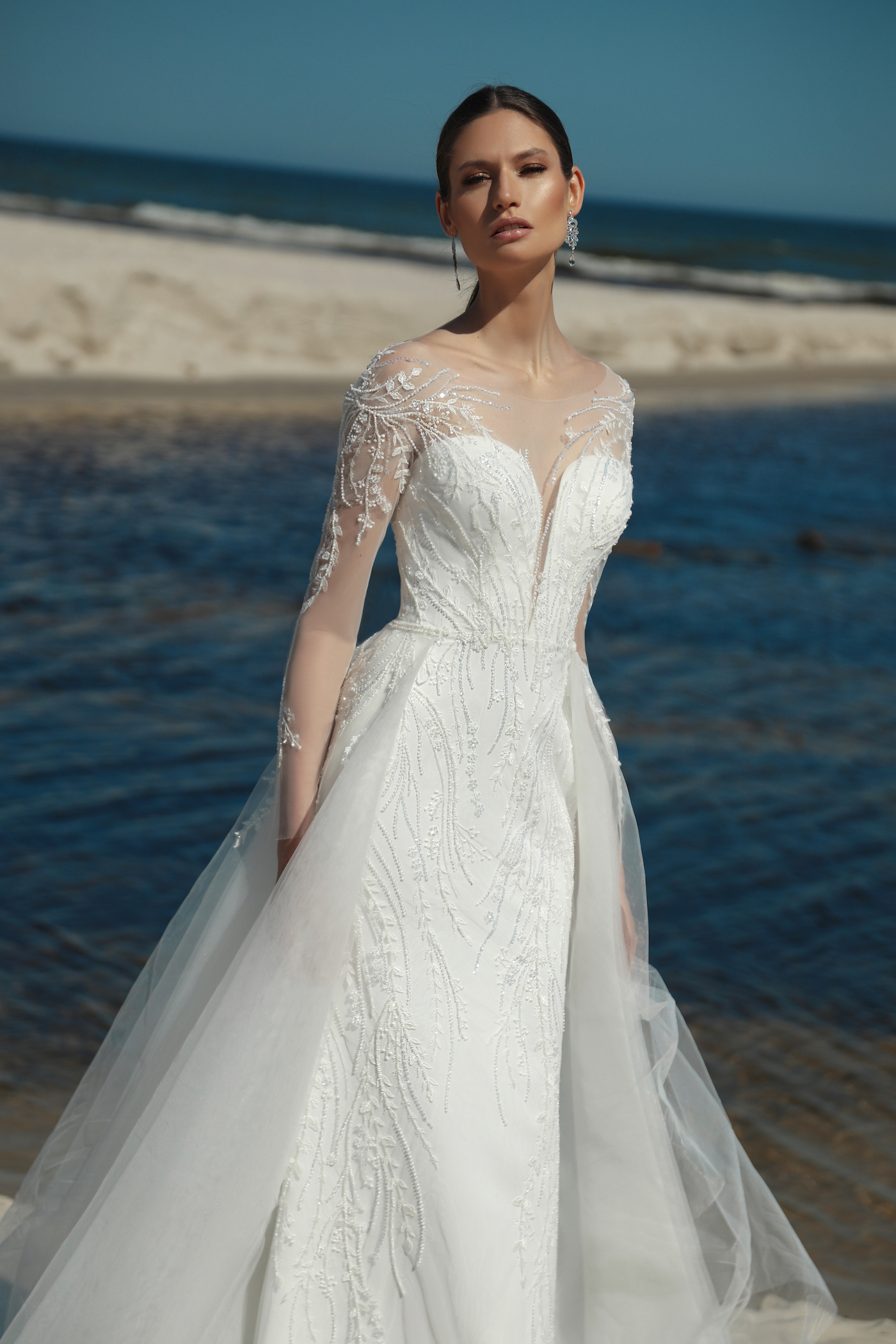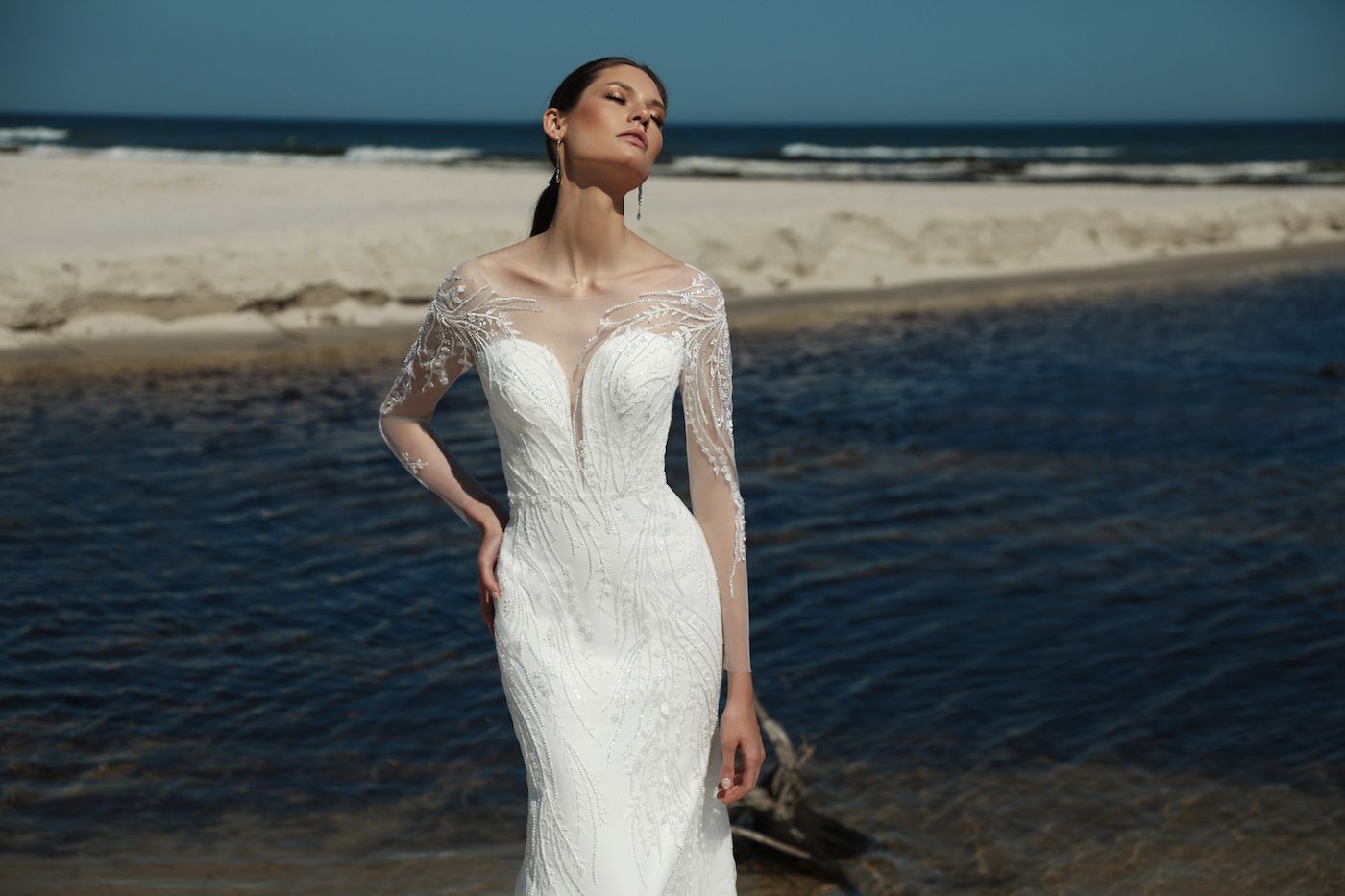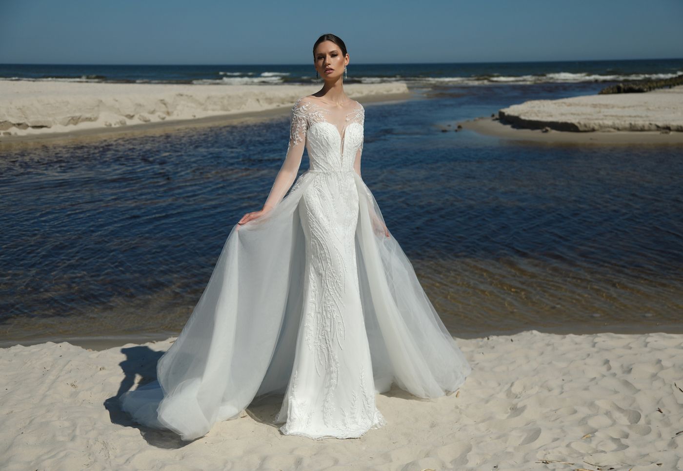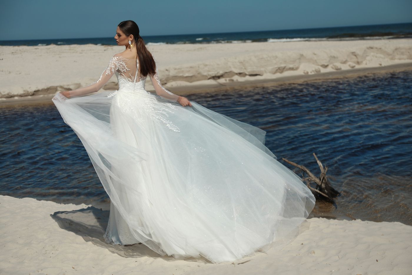 Ein wunderschönes fit & flare Brautkleid. Die Herzkorsage hat einen tiefen Ausschnitt und das Kleid schmiegt sich betont an den Körper. Es ist liebevoll und aufwendig mit Spitze verziert. Im Rückenteil gibt es eine Knopfleiste und die Schleppe aus Glitzertüll und Spitze ist abnehmbar.