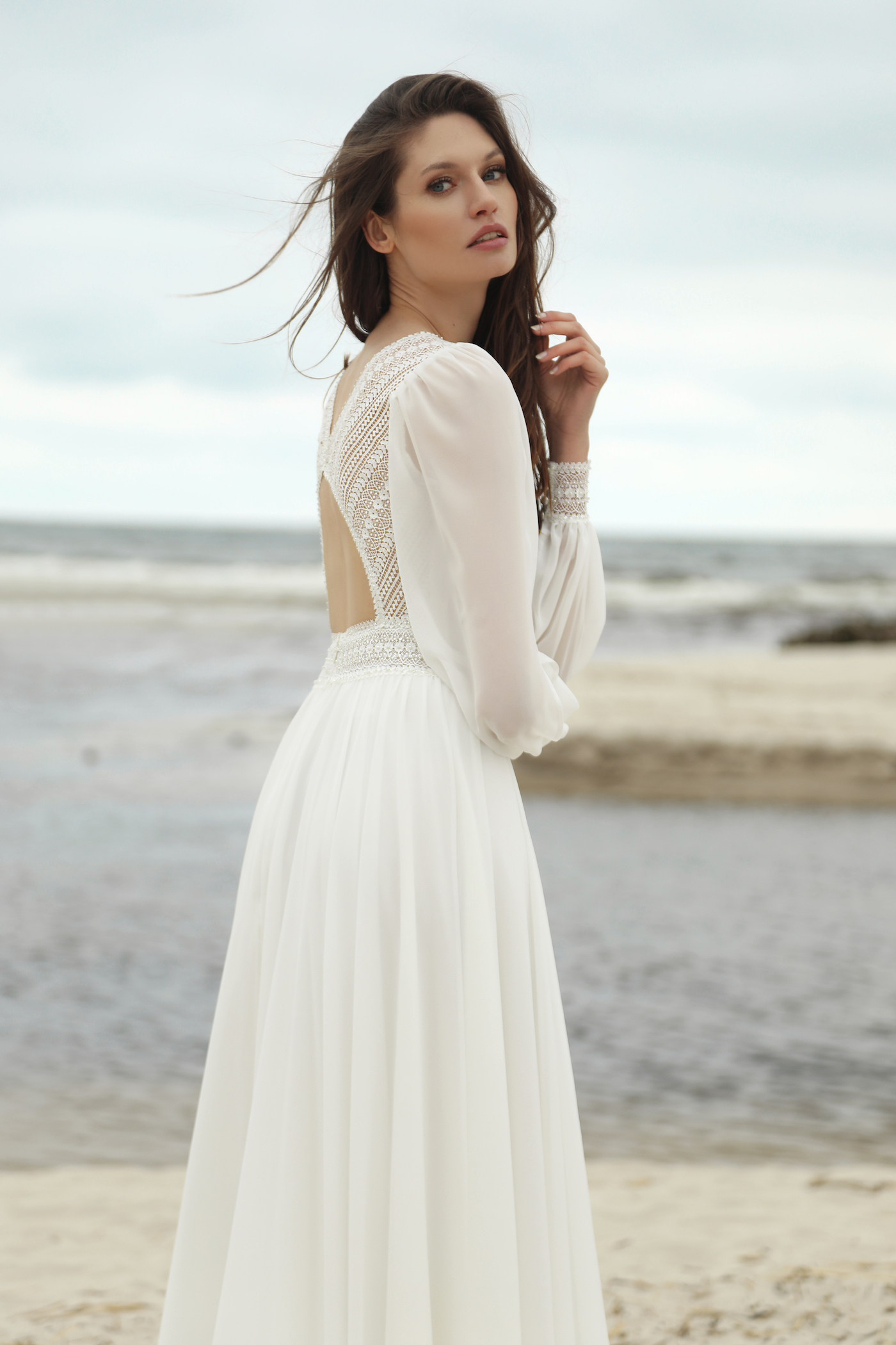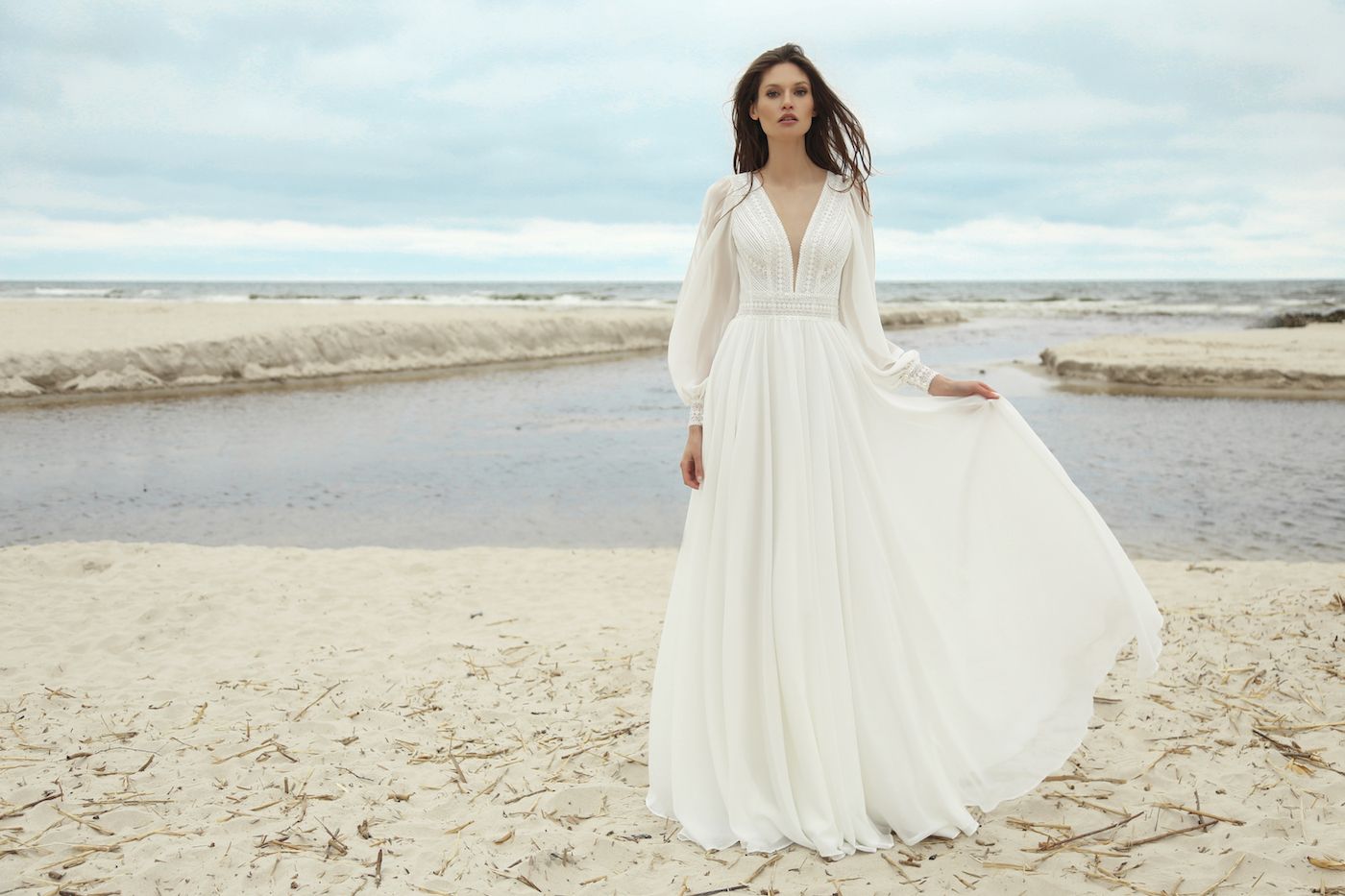 Eva ist ein wunderschönes Brautkleid mit einem tiefen V-Ausschnitt und einen raffiniert geschnittenen Rückenausschnitt. Der Rock und die Ärmel sind aus fließendem Chiffon. Rock und Ärmel können auch gerne aus Tüll bestellt werden. Das Oberteil ist liebevoll mit Perlen und Kristallen bestickt. Ein perfektes Brautkleid für eine Bauernhochzeit in einer Scheune.