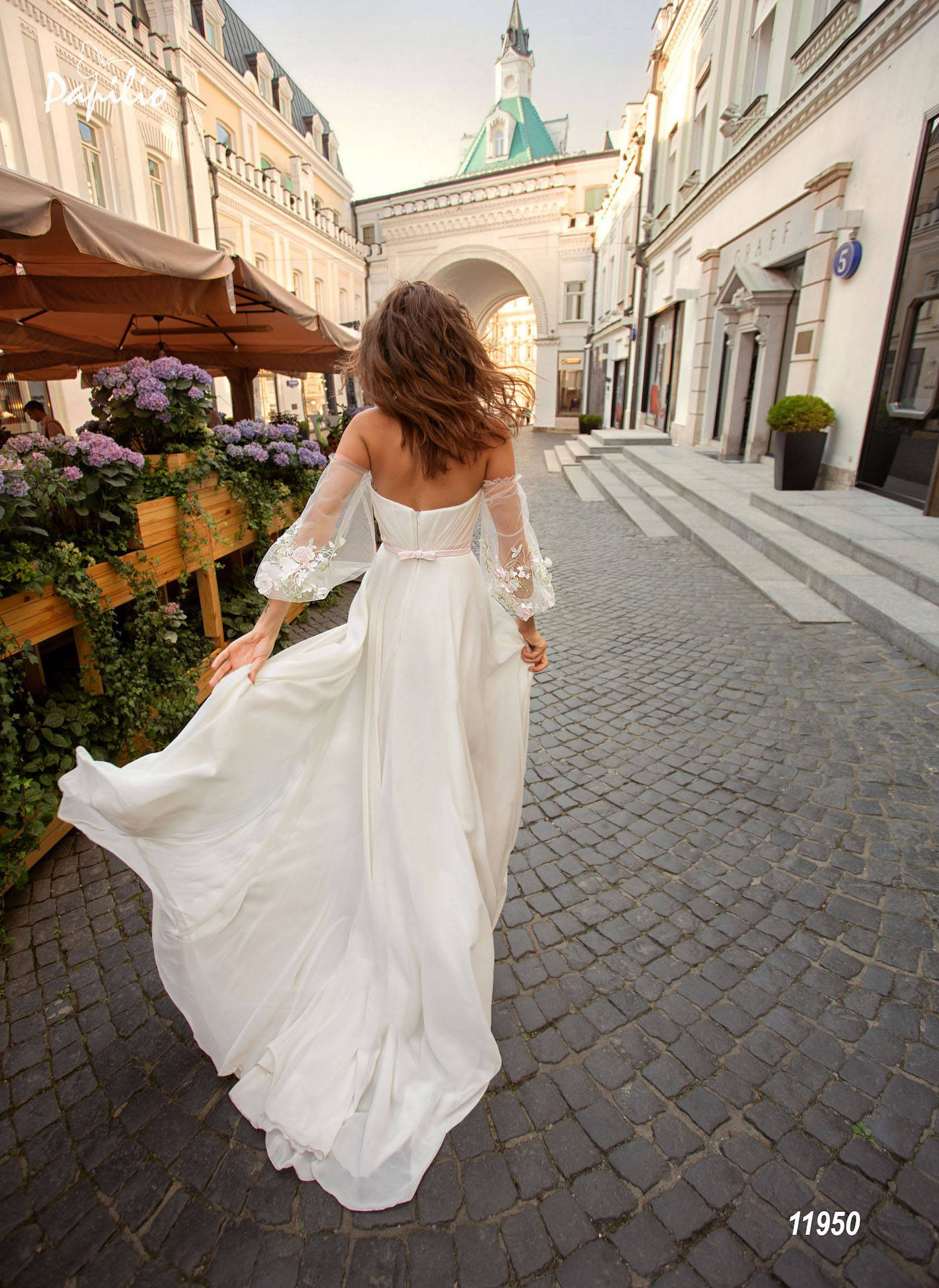 Ein zauberhaftes Corsagenkleid mit Puffärmelm aus Tüll und von Hand aufgenähten 3D Blumen. Schulterfrei. Sehr extravagantes Design für die Experimentalistin. Der Rock hat einen Beinschlitz und eine lange Schleppe und die Corsage ist teils mit rosé Tüll drapiert. Gürtel in Rosé mit Schleife.