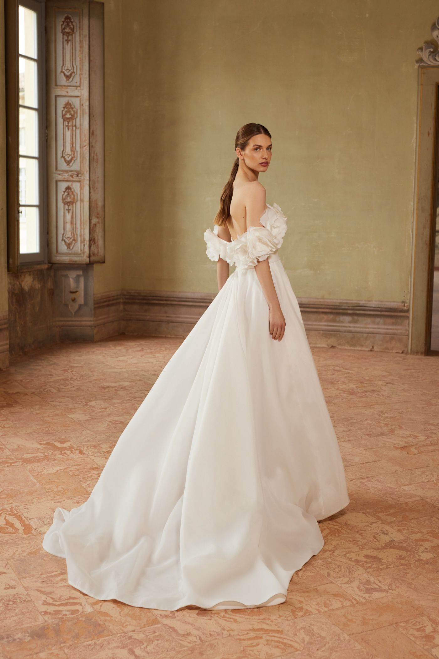 Als Helmar in den Store einzog waren wir alle verzaubert. Dieses Prinzessinnenkleid besteht aus einer drapierten Korsage, einem Rock mit einer langen Schleppe und einem Beinschlitz. Es wird im Rücken mit einem Reißverschluß geschlossen und hat zusätzlich einen BH-Verschluß für den Halt der Korsage eingearbeitet. Oben an der Korsage verzieren Rosen aus Organza den Abschluß und diese Rosen verlaufen verspielt um die Arme.