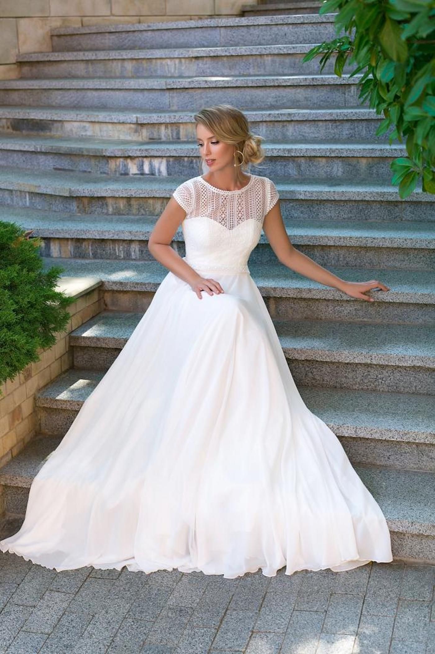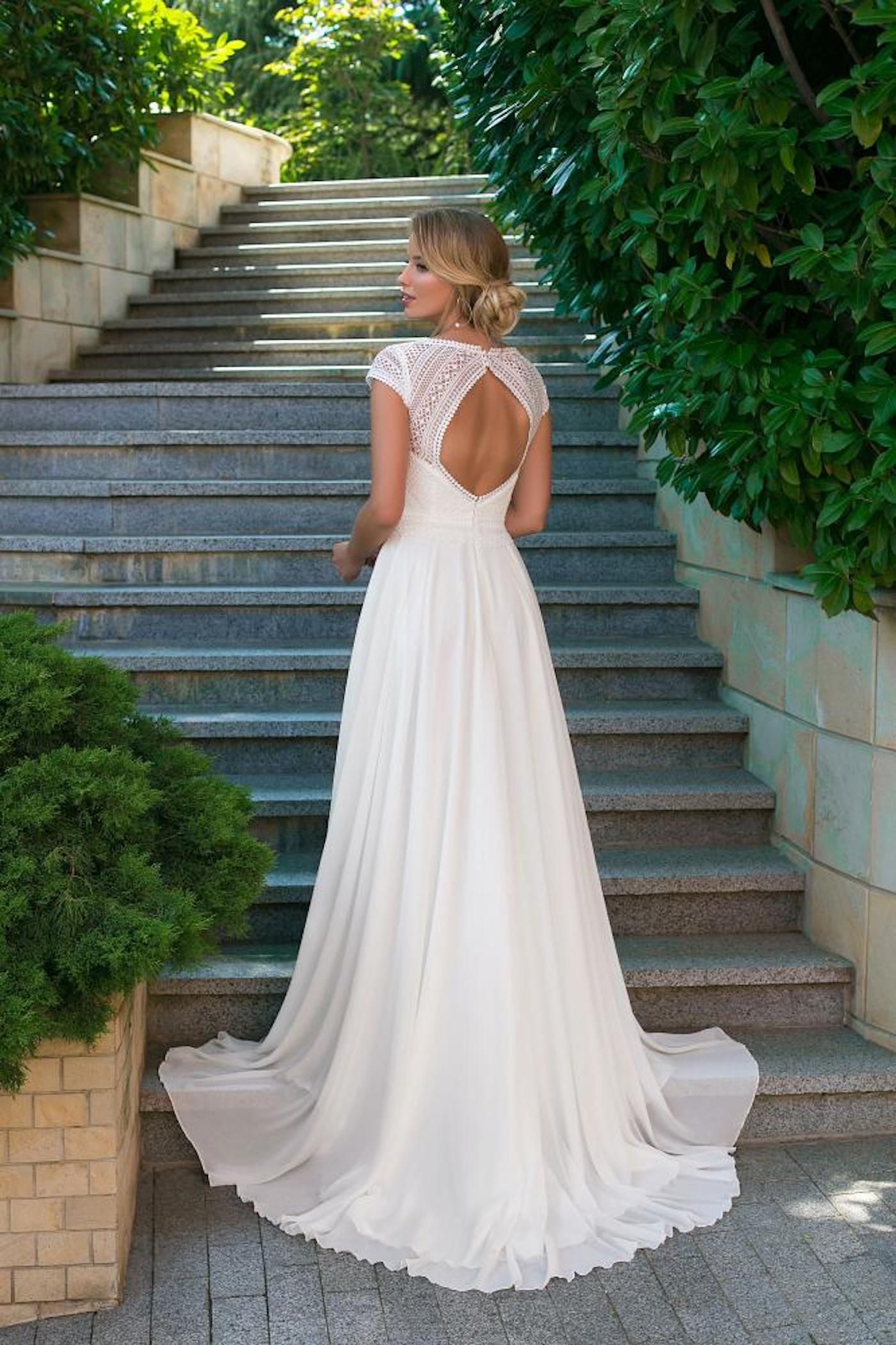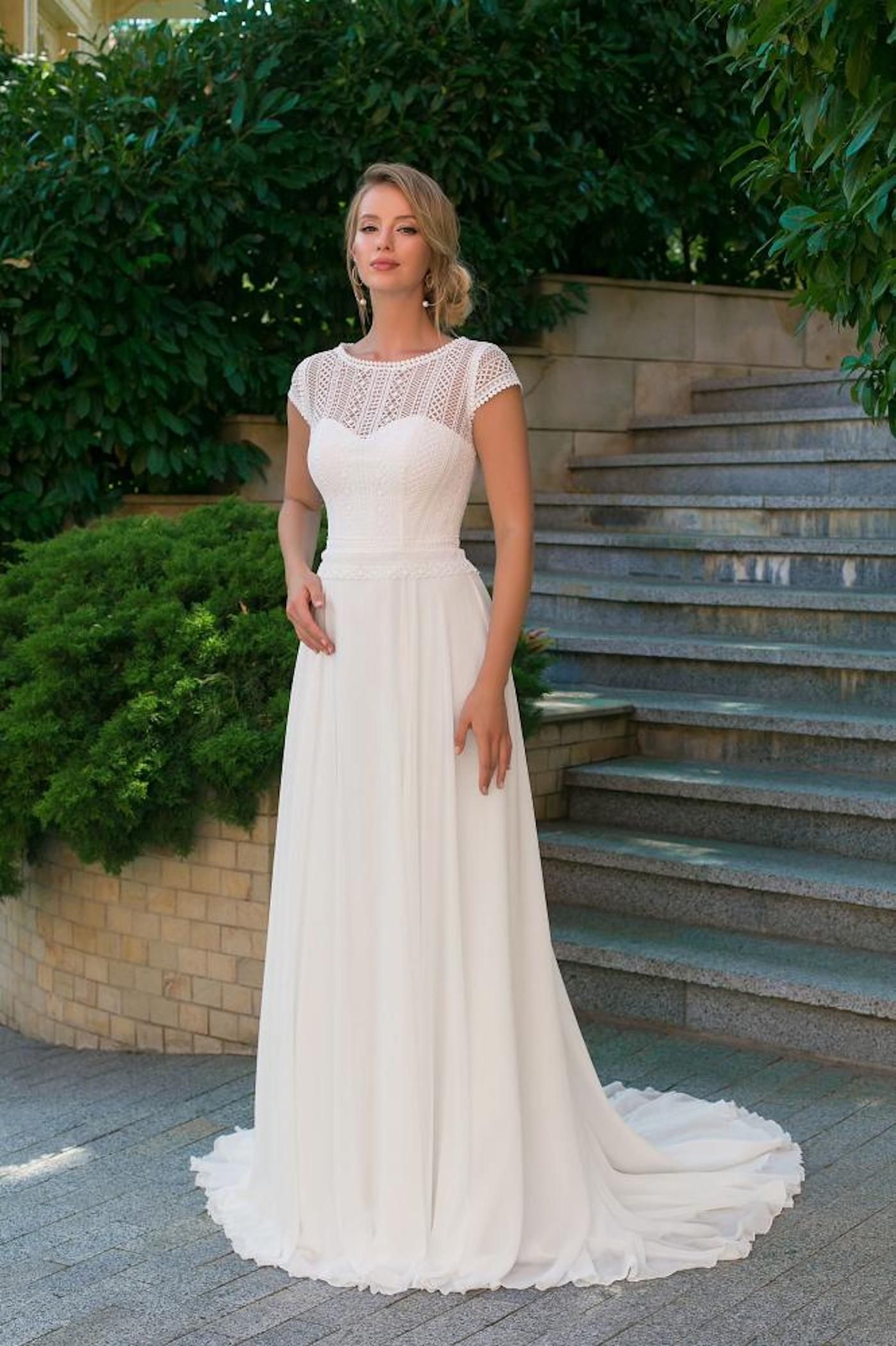 Ein wunderschönes Curvy-Brautkleid mit einem Oberteil aus geometrischer Makrameespitze und einen wunderschönen offen gestalteten Rücken. Es hat angeschnittene Spitzenärmel, der Chiffonrock eine Schleppe und die Taille wird durch einen Spitzenschoß betont.