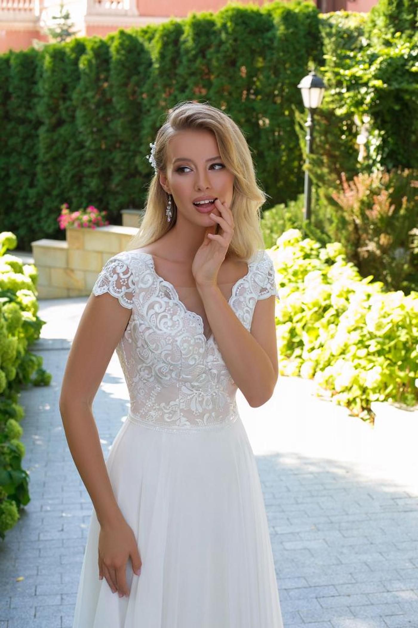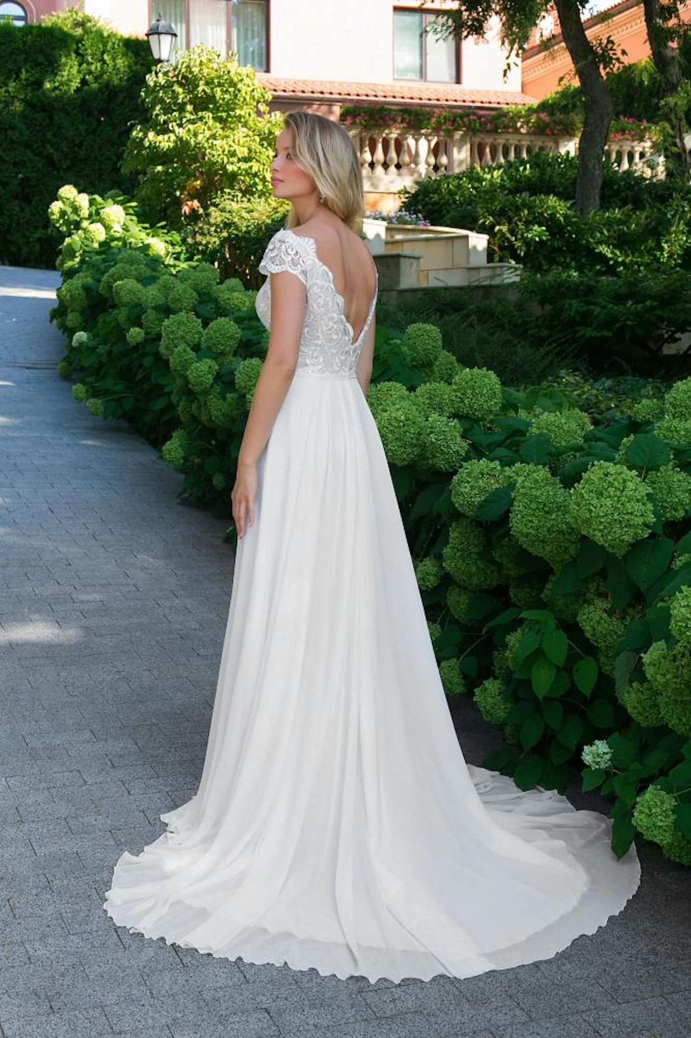 Ein romatisches Curvy-Brautkleid mit V-Ausschnitt vorne und hinten. Unter dem Spitzenoberteil wurde cappuccinofarbiges Innenfutter verarbeitet und der fließende Chiffonrock hat eine Schleppe. Es hat angeschnittene Spitzenärmel und auf der Taille wurde ein zarter Spitzengürtel platziert. Maike ist ein romantisch verspieltes Brautkleid.