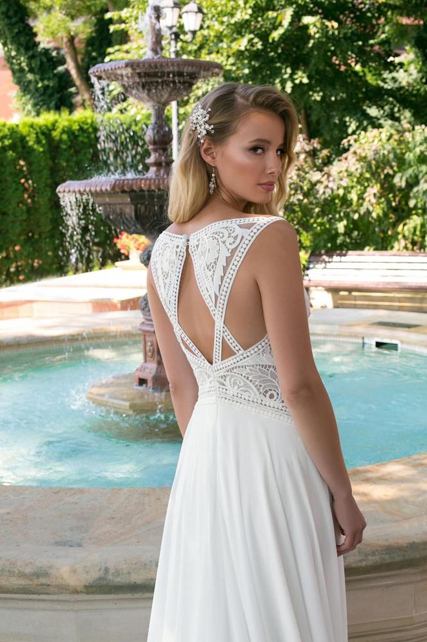 Ein wunderschönes Curvy-Brautkleid mit Trägern im Boho-Stil mit mehreren Cut-Outs im Rücken. Es hat ein transparentes mit Makrameespitze besetztes Oberteil mit einem ausdrucksstarken Blumenmuster. Der Ausschnitt ist mit Spitzenbesatz verziert und der Chiffonrock hat eine Schleppe.