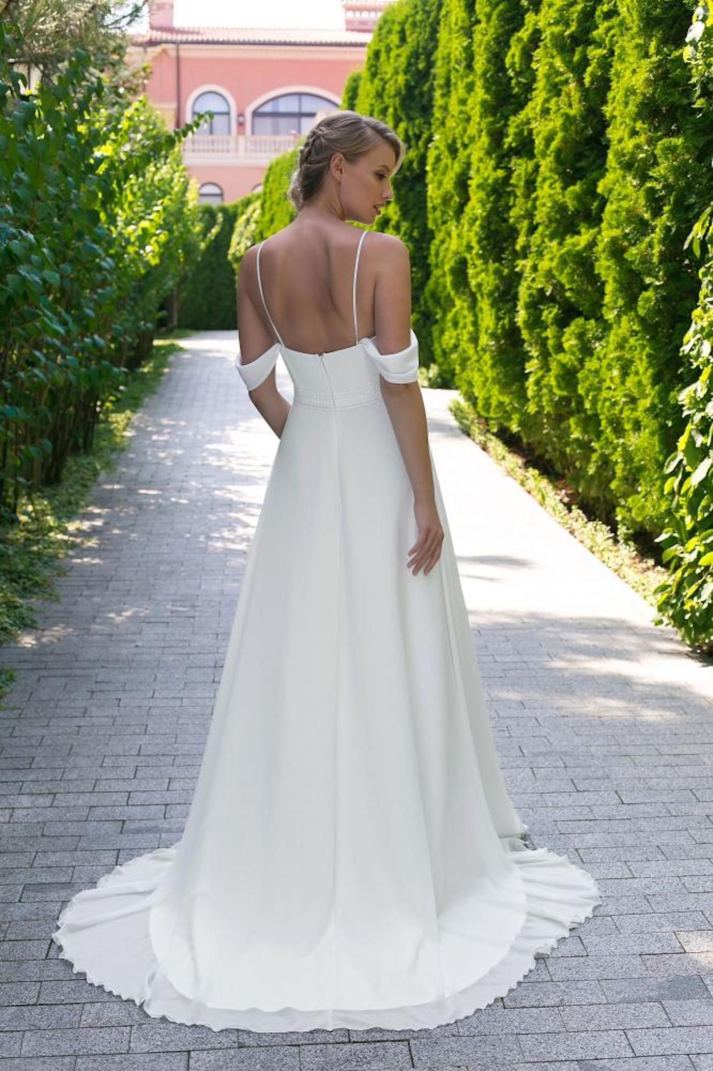Melissa ist ein klassisches Curvy-Brautkleid aus leicht fliessendem Chiffon mit einem herzförmigen Ausschnitt. Das Kleid hat Spaghettiträger, Off-Shoulder Chiffonärmel und einen wunderschönen Makrameegürtel. Das Kleid kann gerne mit einem Tüllüberwurf oder Spitzerbolero aufgewertet werden.