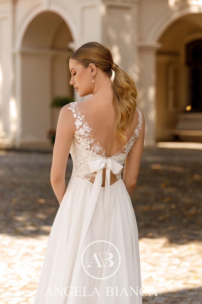 Nancy ist im Vorderteil sehr ruhig gehalten aber im Rückenteil ein absoluter Hingucker. Die Drapage im Vorderteil schmeichelt der Taille und der Spitzenrücken wird mit einer Schleife gehalten. Nancy hat eine Schleppe.
