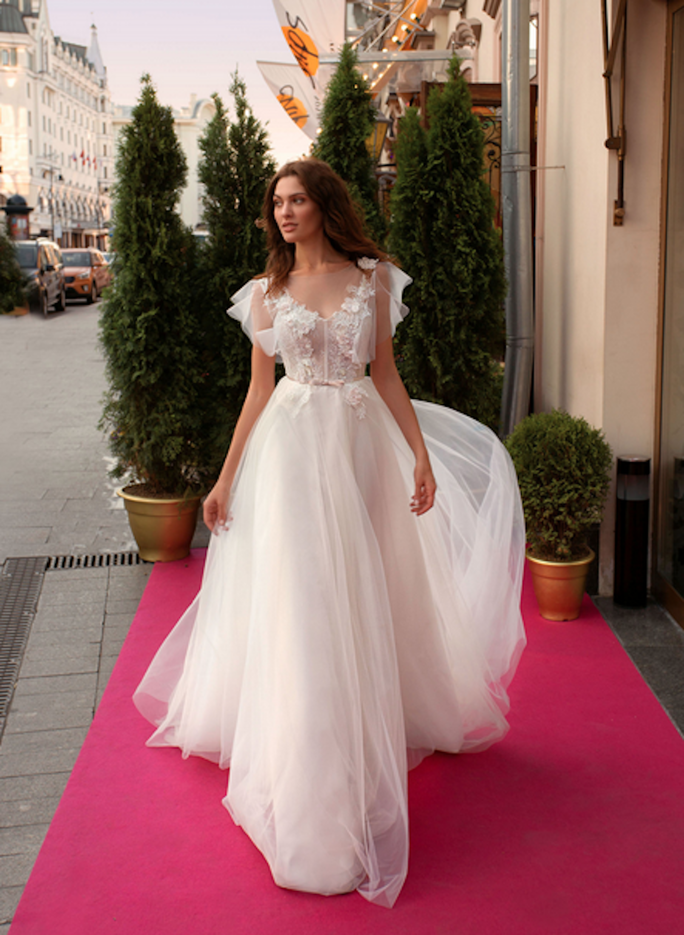 Ein zauberhaftes Prinzessinnen Kleid wie im Märchen. Der Hingucker sind die von Hand aufgenähten 3D Blumen. Der weite Tüllrock hat eine lange Schleppe. Corsage und rosé Gürtel mit Schleife.