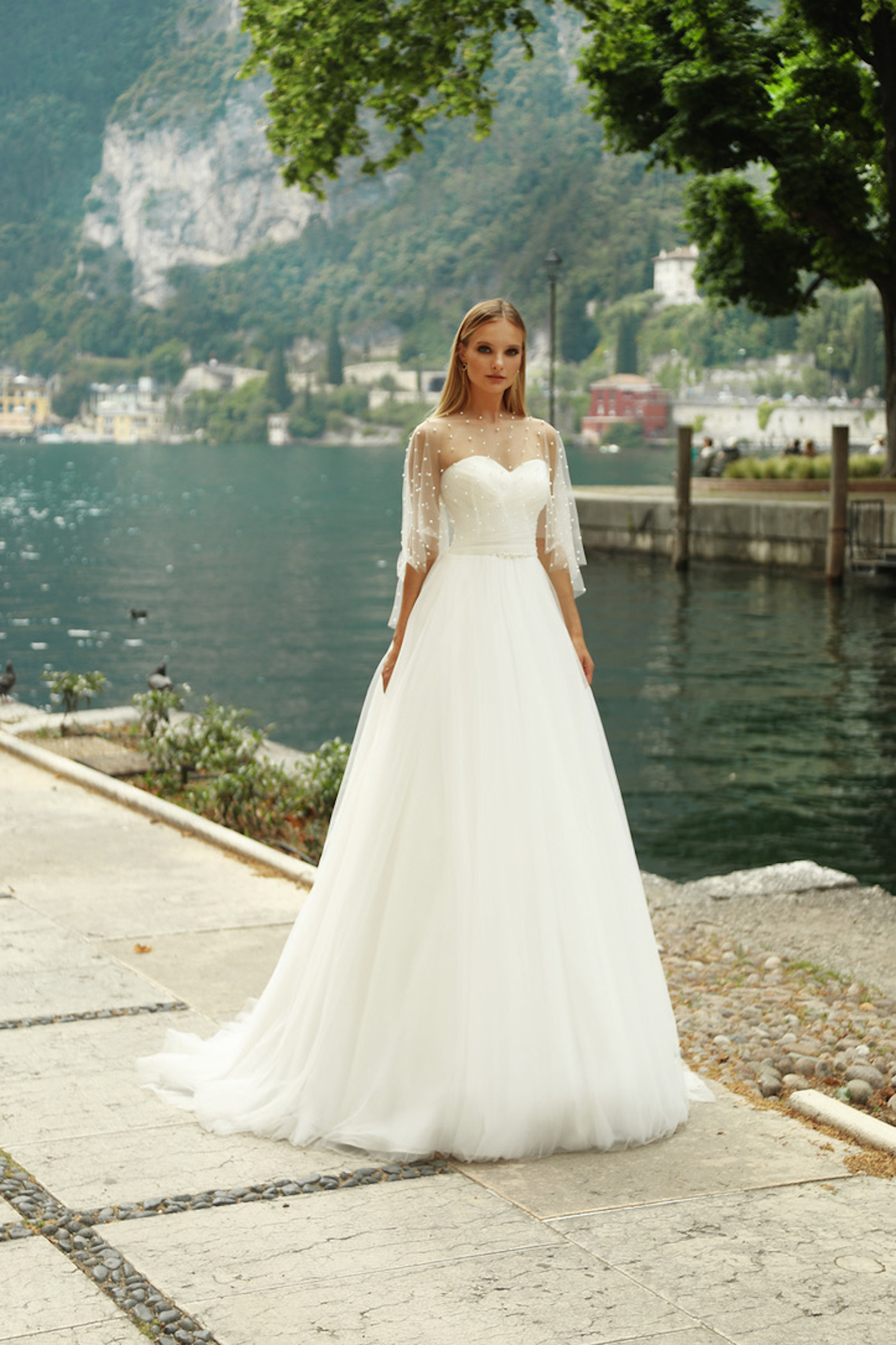 Eine transparente Brautbluse aus zartem Pünktchentüll zum knöpfen und schnüren. Die Arme mit hohen…