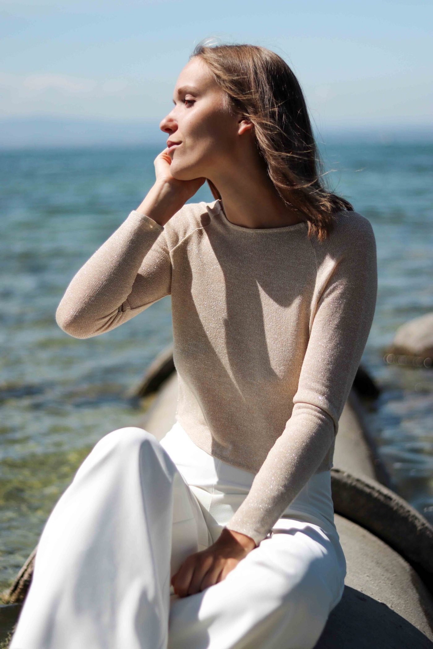 Ein wunderschöner Zweiteiler mit einem Oberteil aus Spitze, nude unterlegt und angeschnittenen Ärme…