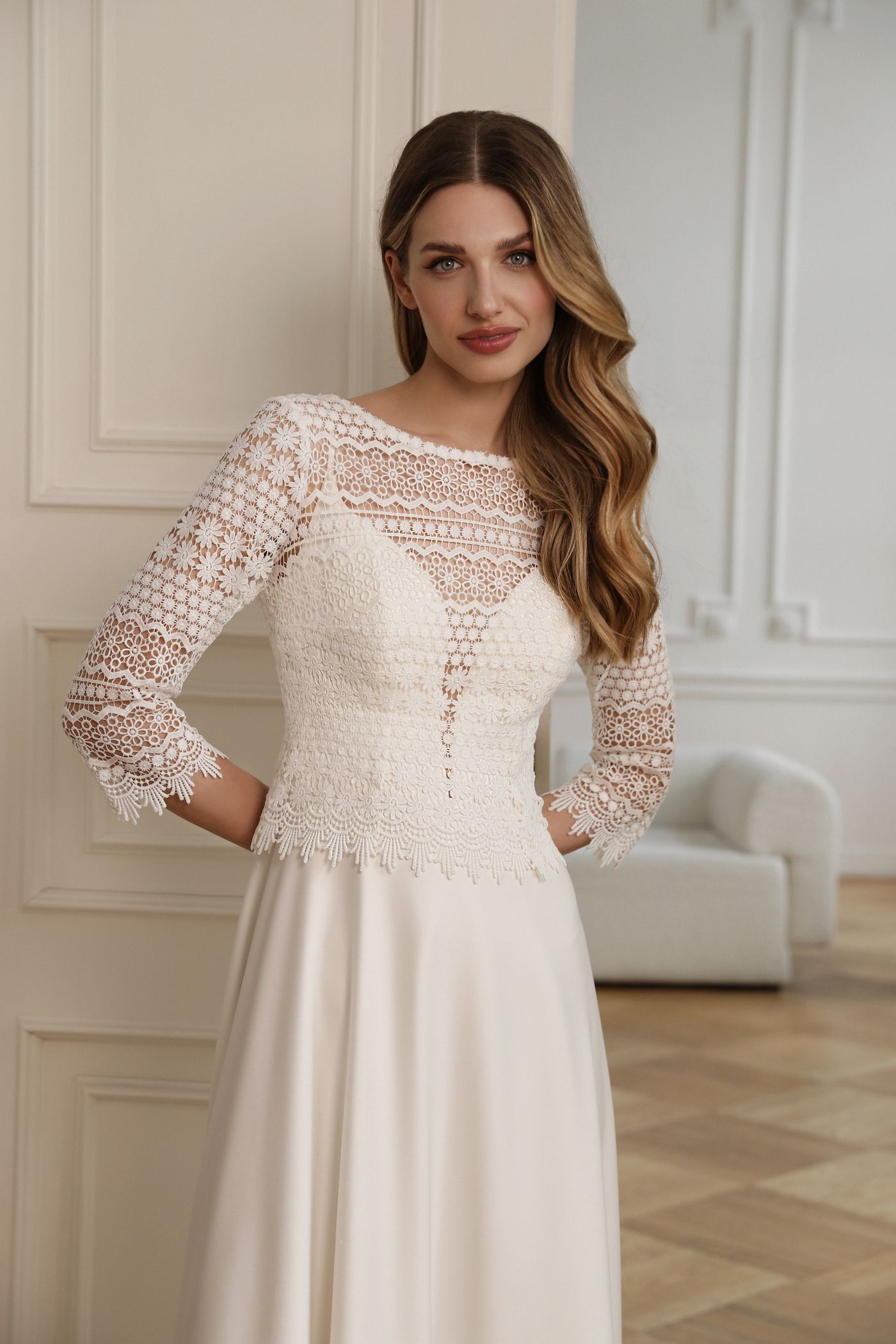 Bolero aus geometrischer Spitze. Passt perfekt zum Bohostyle. Mit Ärmeln und Knopfleiste im Rückenteil.
