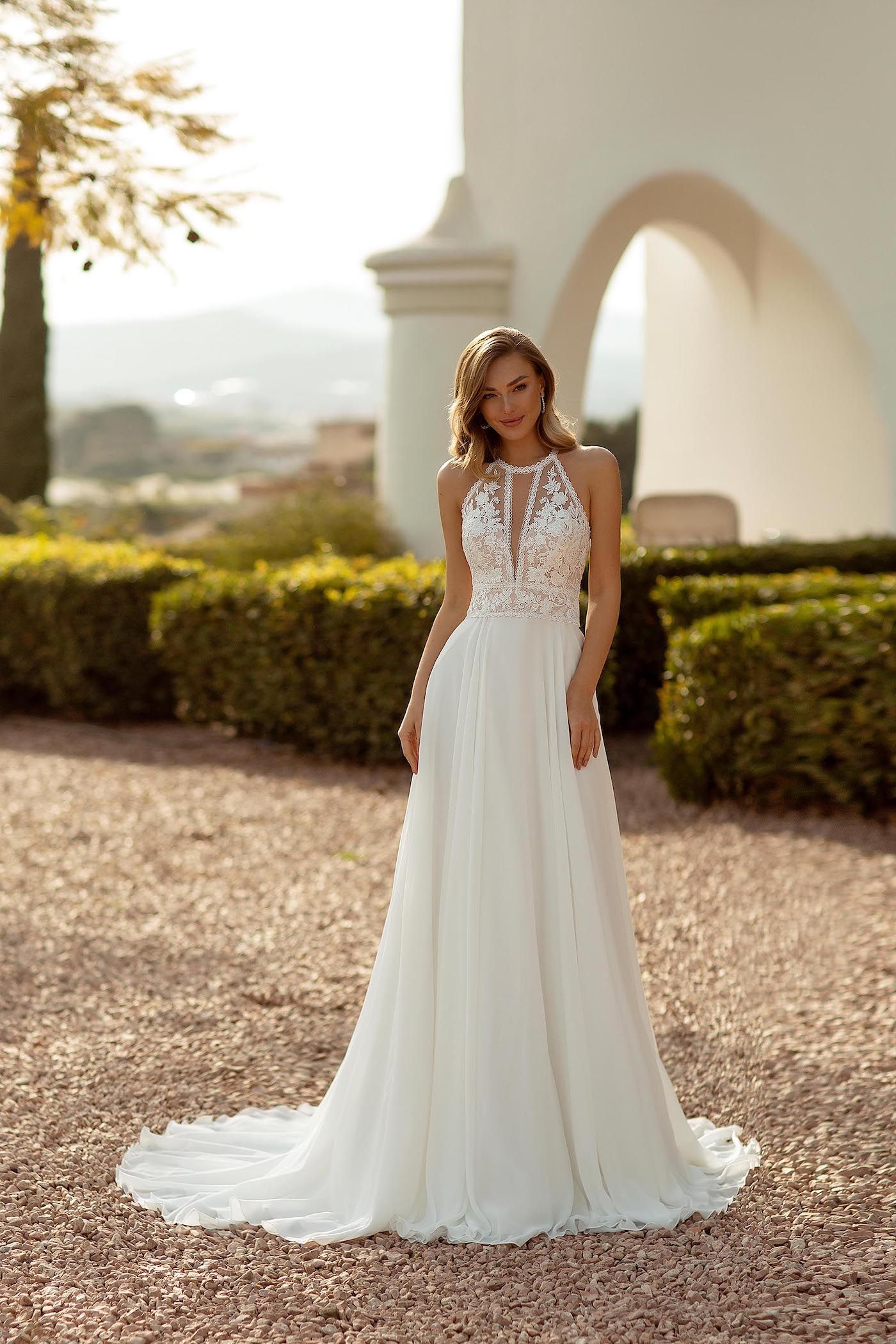 Ein wunderschöner Zweiteiler mit einem Neckholder-Oberteil aus Spitze, nude unterlegt. Dazu empfehlen wir einen langen Tüllrock mit Schleppe der ebenfalls nude unterlegt ist. Aber auch Chiffonröcke oder Hosen.