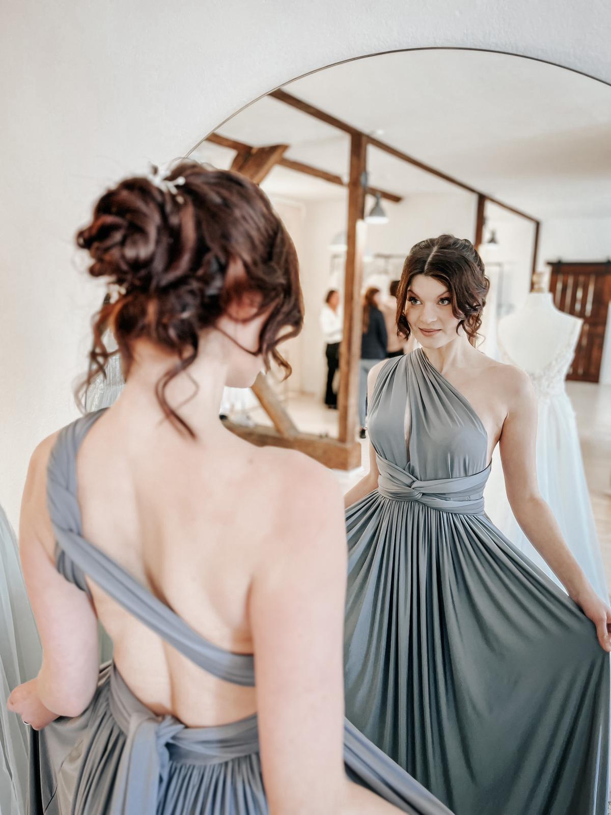 Neu im Store - in 28 verschiedenen Farben. Die schönsten Brautjungfernkleider von Eliza & Ethan in Wickeloptik. Dabei sind die verschiedensten Modelle möglich.