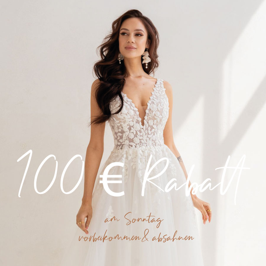 Wow - unser Eröffnungsangebot:Am Sonntag den 10.09.23 vorbeikommen, Termin zur Anprobe buchen und 100 € Rabatt sichern auf ein Brautkleid ab einen Wert von 1000 €.