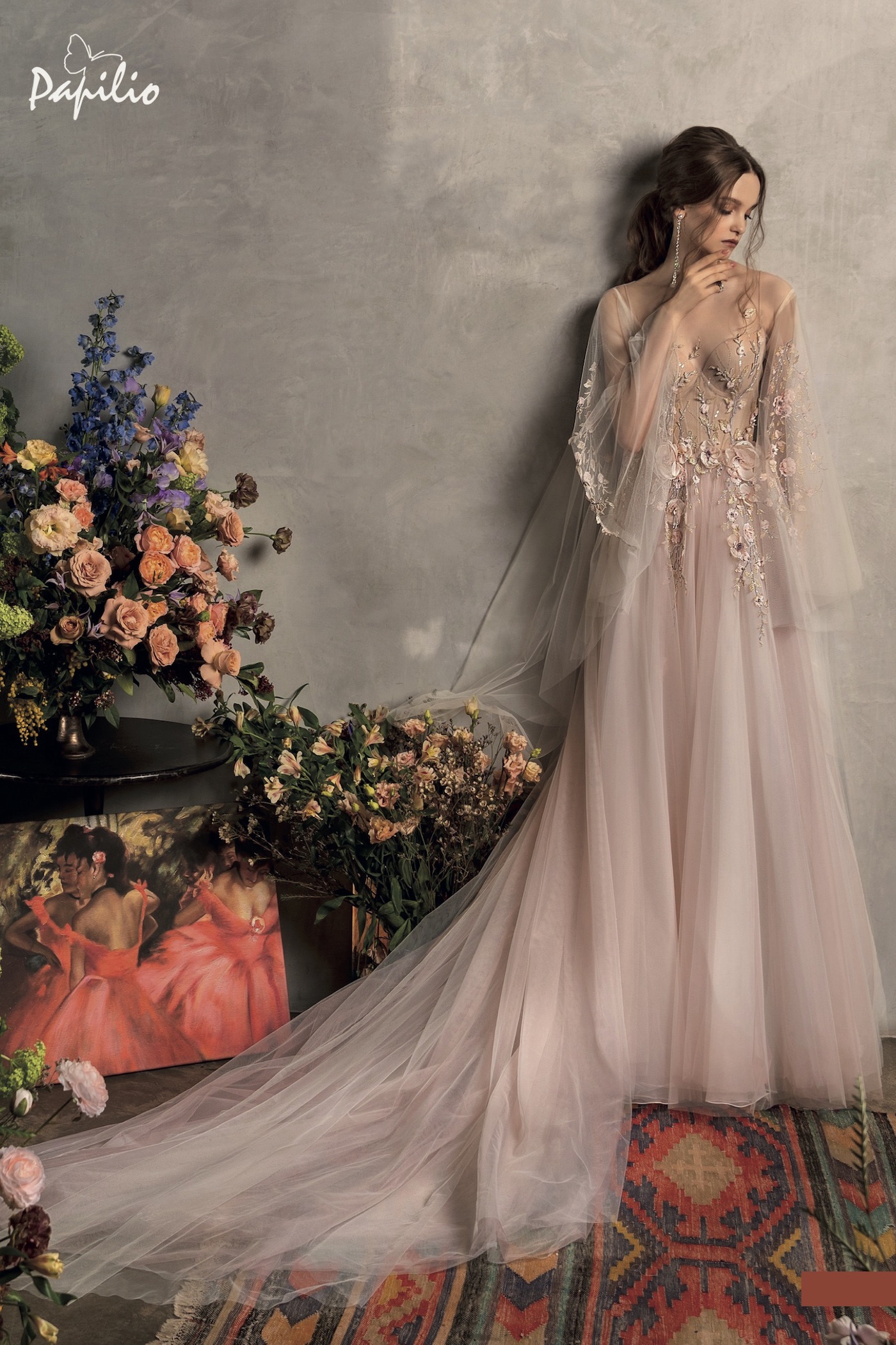 Ein zauberhaftes Prinzessinnen Kleid für die Experimentalistin. Der Hingucker sind die weiten Fledermausärmel aus Tüll mit den von Hand aufgenähten großen bunten 3D Blumen. Diese bunten 3D Blumen verzieren auch liebevoll das Oberteil und laufen großzügig in den Rock. Der Tüllrock hat eine lange Schleppe. Corsage
