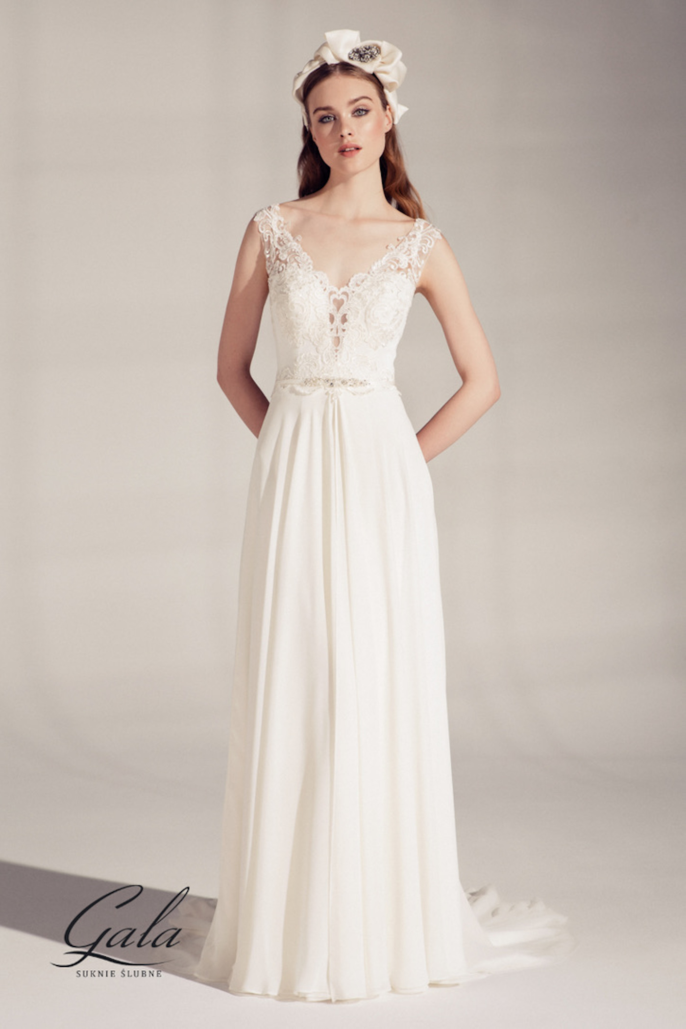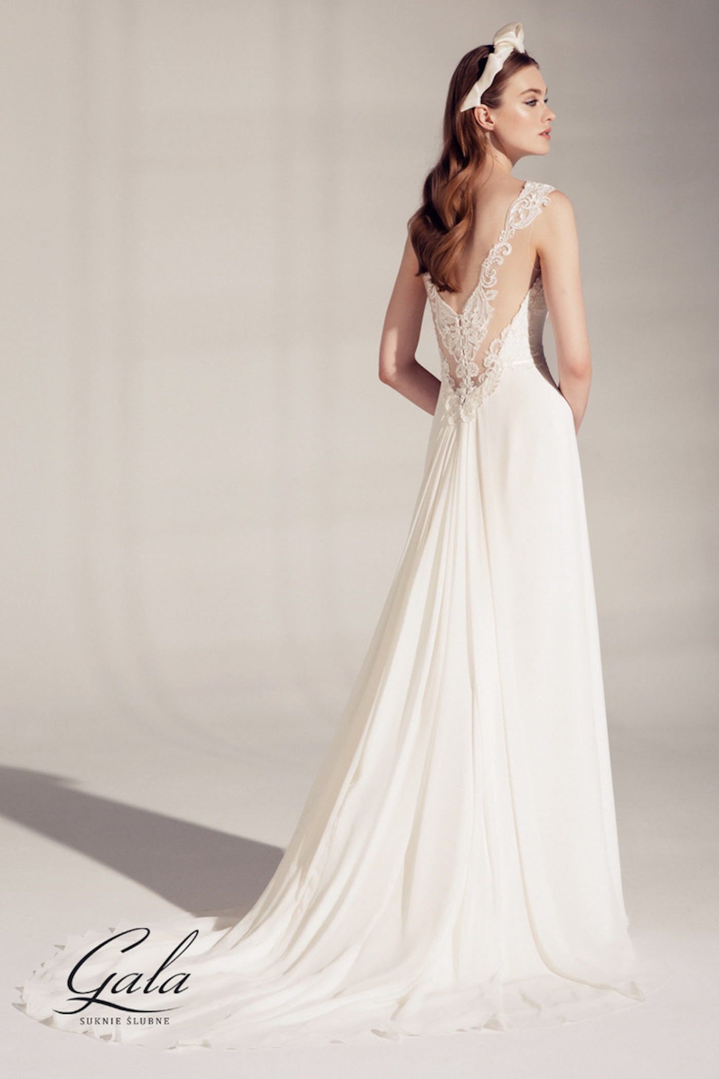 Ein wunderschönes klassisches Vintagebrautkleid. Der Rücken ist vertieft und das Kleid hat eine lange Schleppe. Es ist liebevoll mit Spitze verziert.