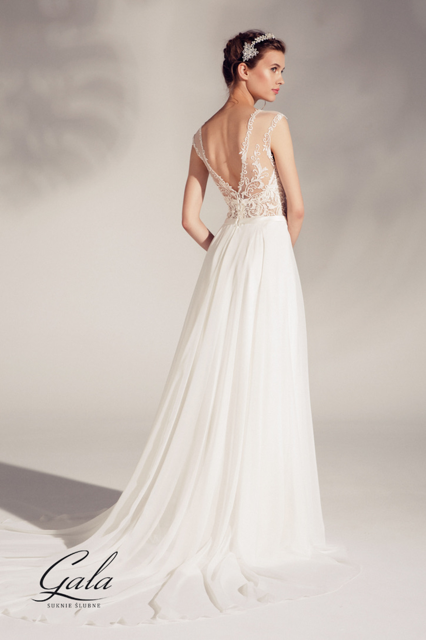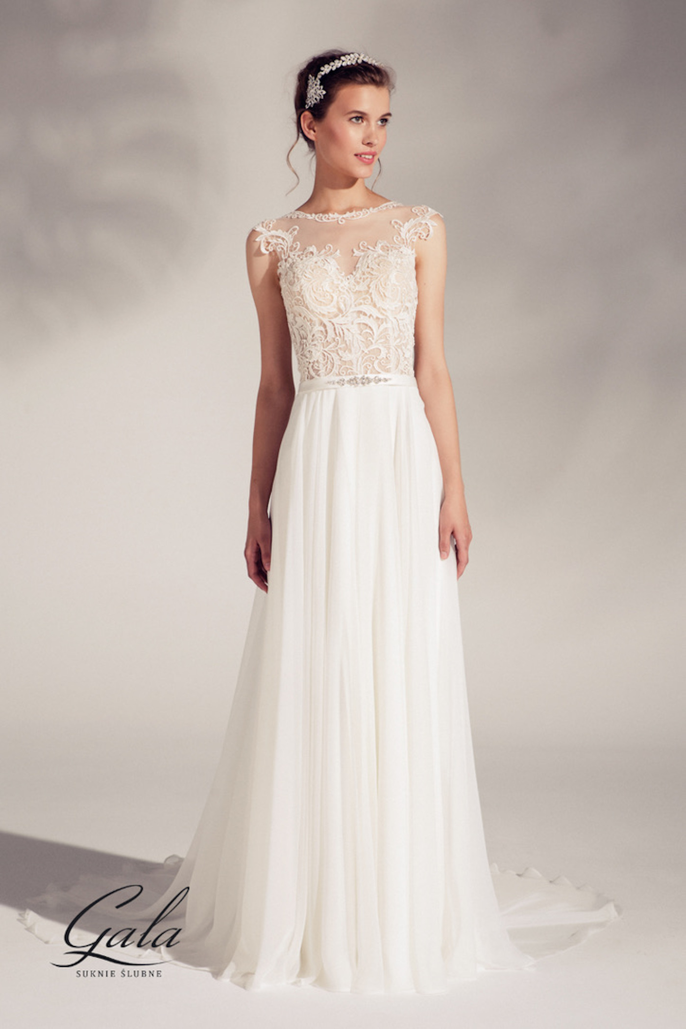 Ein klassisches Brautkleid mit einem weich fließenden Chiffonrock. Das Oberteil besticht durch seine transparenz und ist liebevoll mit Spitze verziert. Das Kleid hat eine Corsage und der Gürtel eine Strassapplikation.