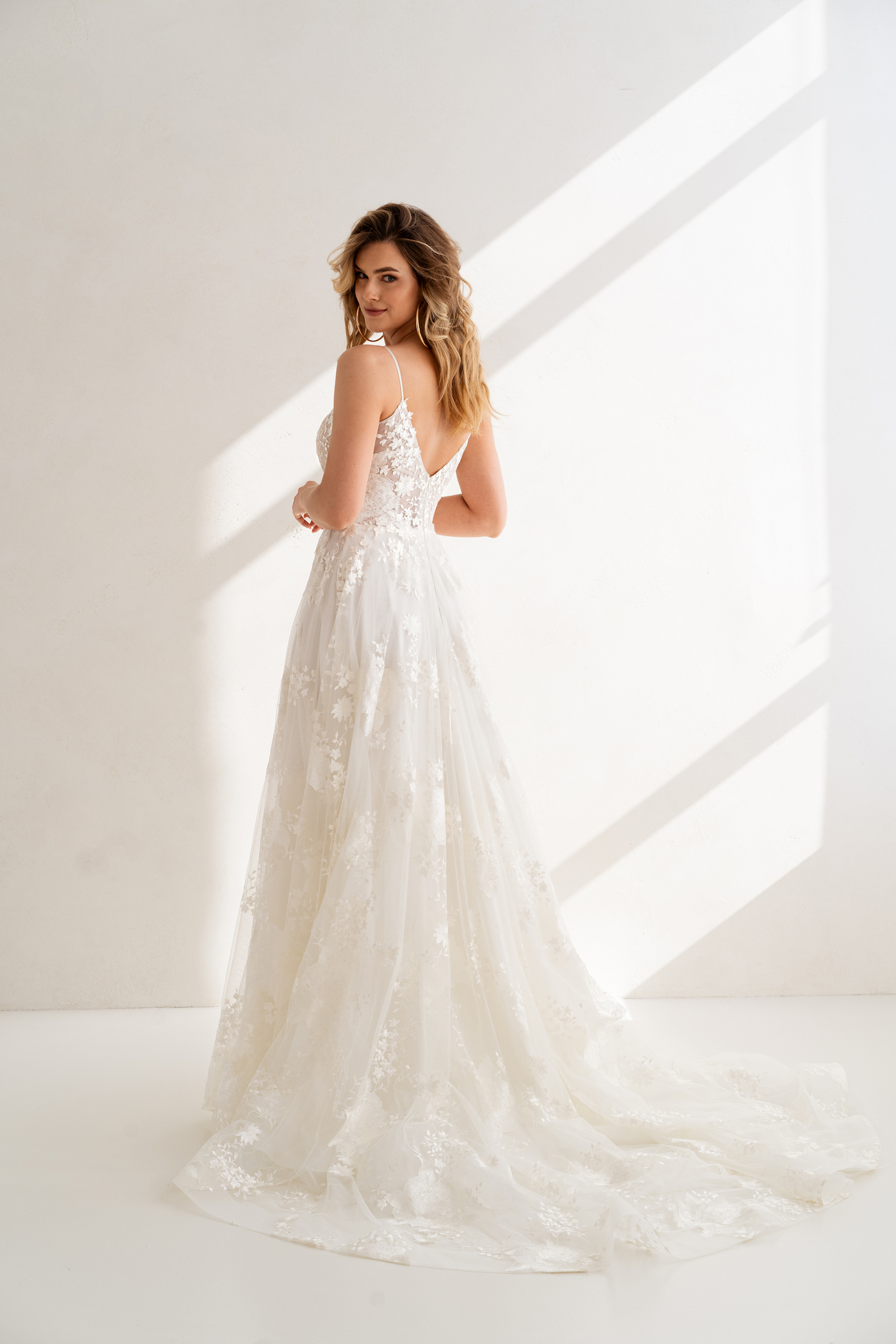 Unser absoluter Hingucker ist Ashley. Dieses Brautkleid besteht komplett aus einer wunderschönen floralen Spitze und hat eine lange Schleppe. Das Oberteil hat vorne und hinten einen V-Ausschnitt und Spaghettiträger. Besonders sexy ist der tiefe V-Ausschnitt im Vorderteil. Der Rock ist aus einer Tüllspitze die leicht glitzert. Wir lieben Ashley ...