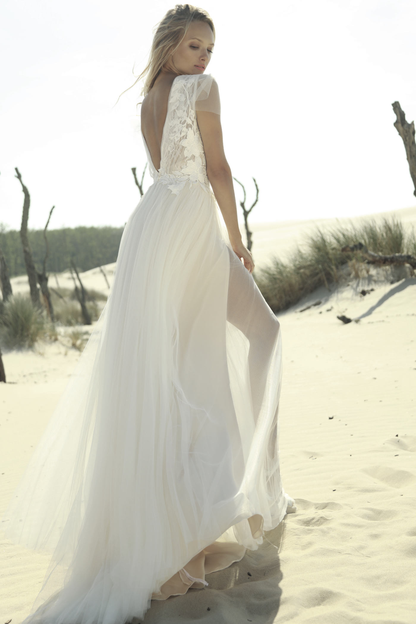 Ein absolutes Lieblingskleid. Der weite Rock mit Schlitz besteht aus mehreren Lagen Softtüll, die in eine lange Schleppe übergehen. Das Oberteil des Kleides ist aus drapiertem Softtüll mit floraler Spitze. Ein tiefer Ausschnitt aus Tüll streckt die Körpersilouette.