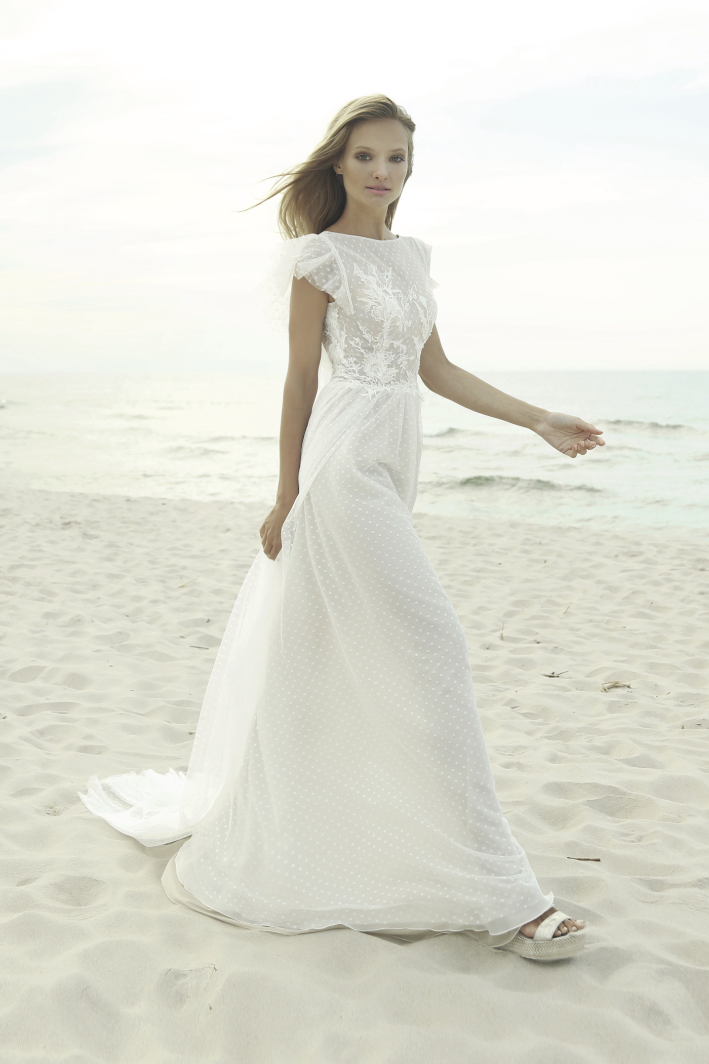 Eigenschaften: ohne Mieder, U-Boot-Ausschnitt, Stoff: Pünktchen-Tüll und Spitze, mit Schleppe, kurze Ärmel
