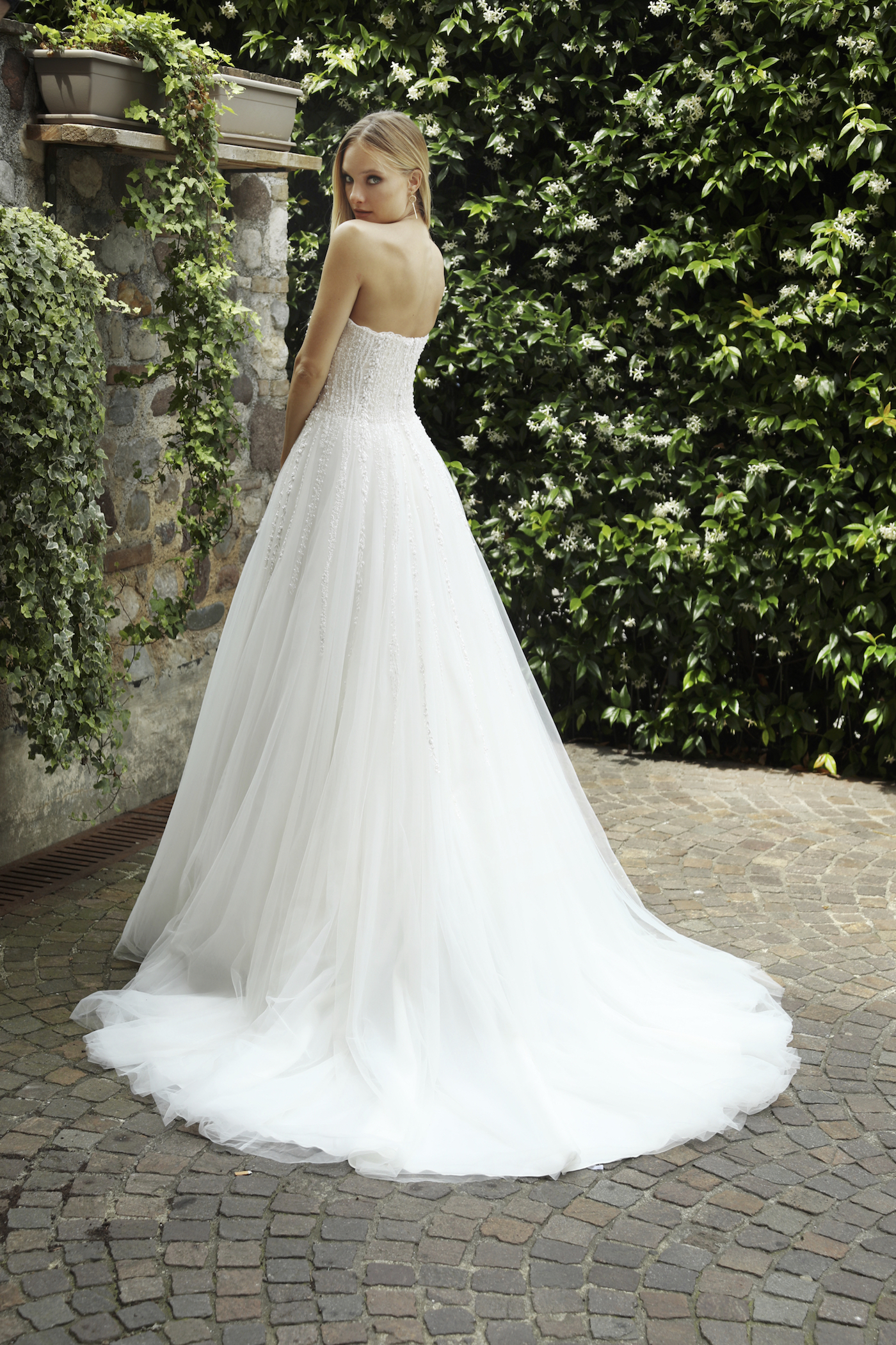 Klassisches Brautkleid. Das Corsagen-Oberteil mit geradem-Ausschnitt wird mit vielen Kristall- und Perlenketten bestickt. Der weite Rock mit einer Schleppe besteht aus mehreren Lagen Tüll. Die Kristall- und Perlenketten laufen in den Rock über.
