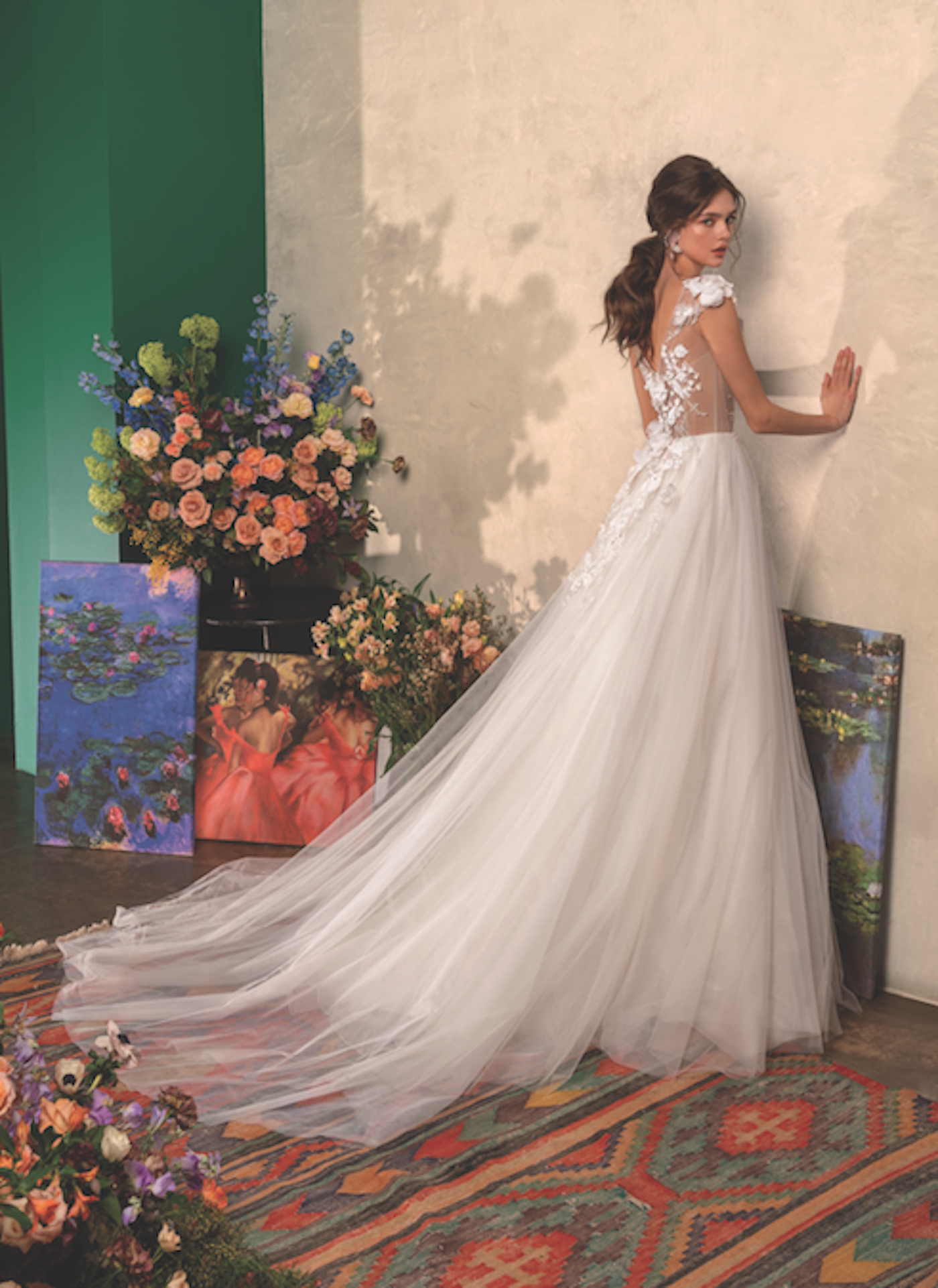 Ein zauberhaftes Prinzessinnen Kleid wie im Märchen. Der Hingucker sind die von Hand aufgenähten 3D Blumen die in den Rock übergehen. Der weite Tüllrock hat eine lange Schleppe. Corsage