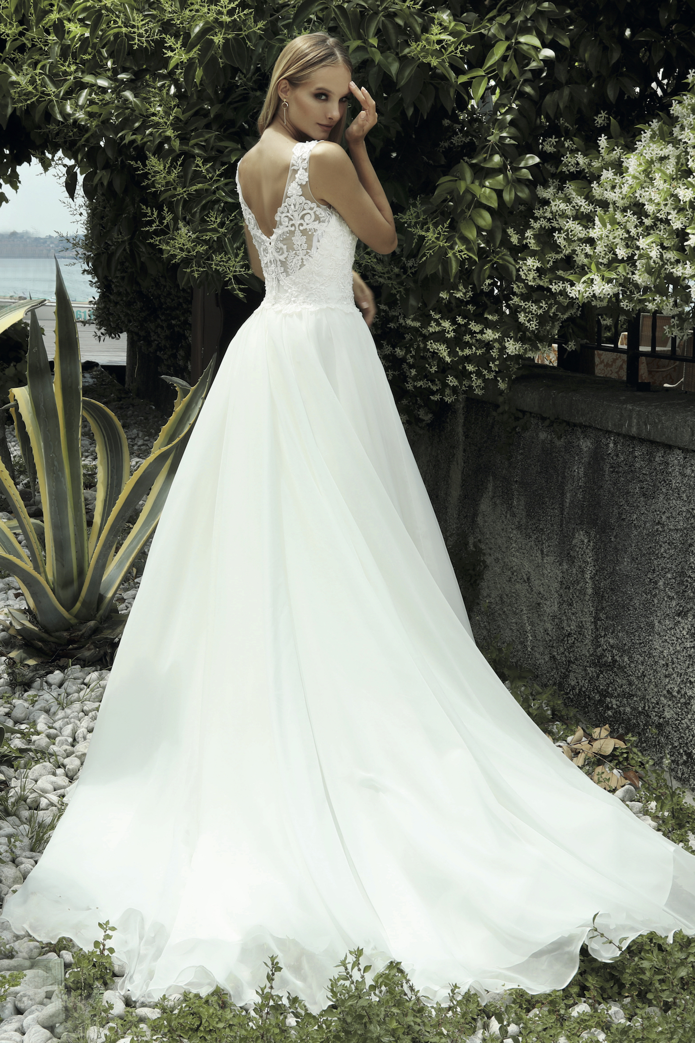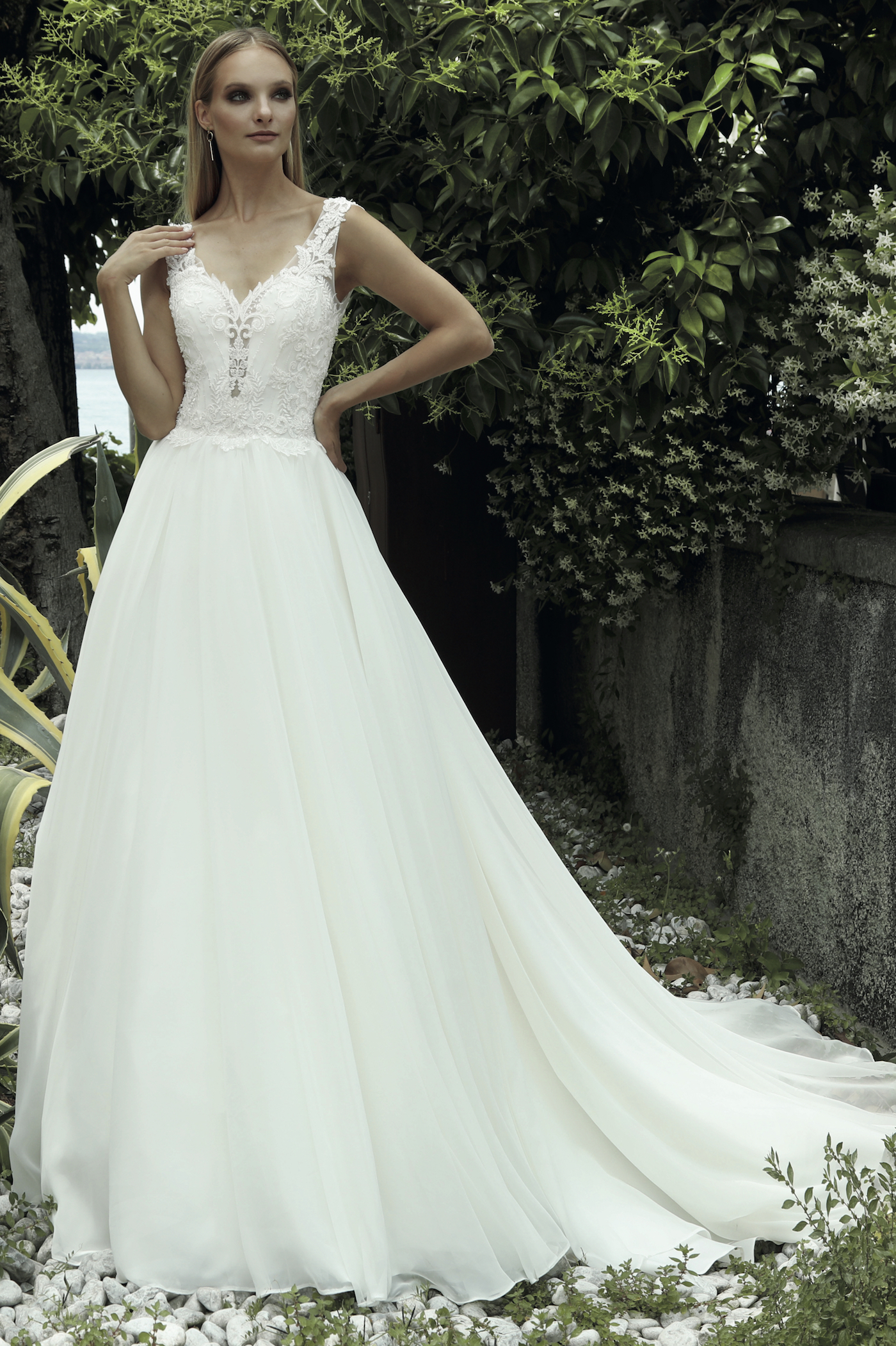 Chiffon-Kleid mit Schleppe geschmückt mit einer Pailletten bestickten Spitze. Der V-Ausschnitt verlängert optisch die Silhouette und gleicht den voluminösen Rock aus. Träger mit Spitze verziert verleihen halt.