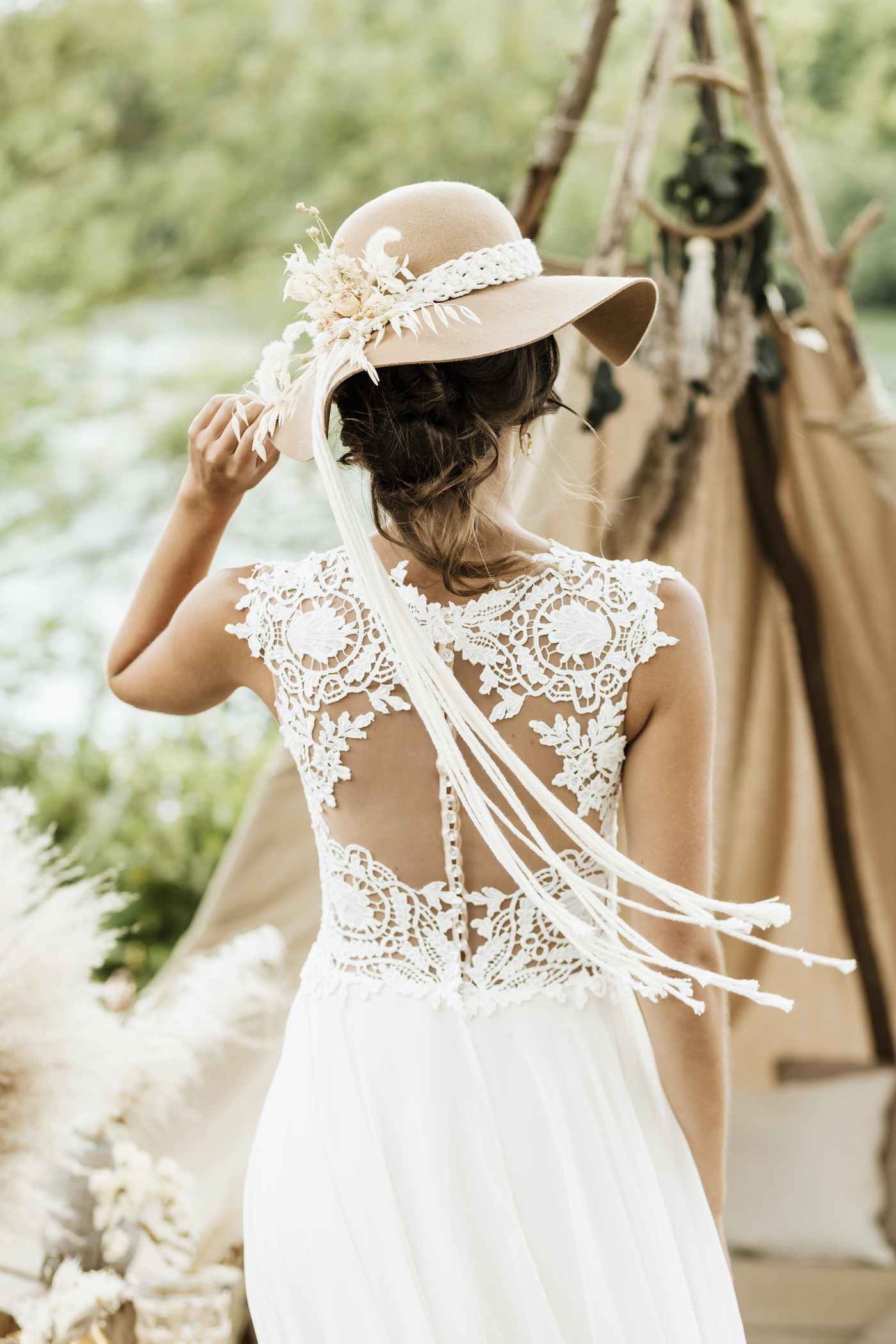 Eigenschaften: Boho-Stil, Stoffe: Chiffon mit seidigem Geflecht und Gipüre mit Schleppe, ärmellos, V-Ausschnitt, ohne Mieder.