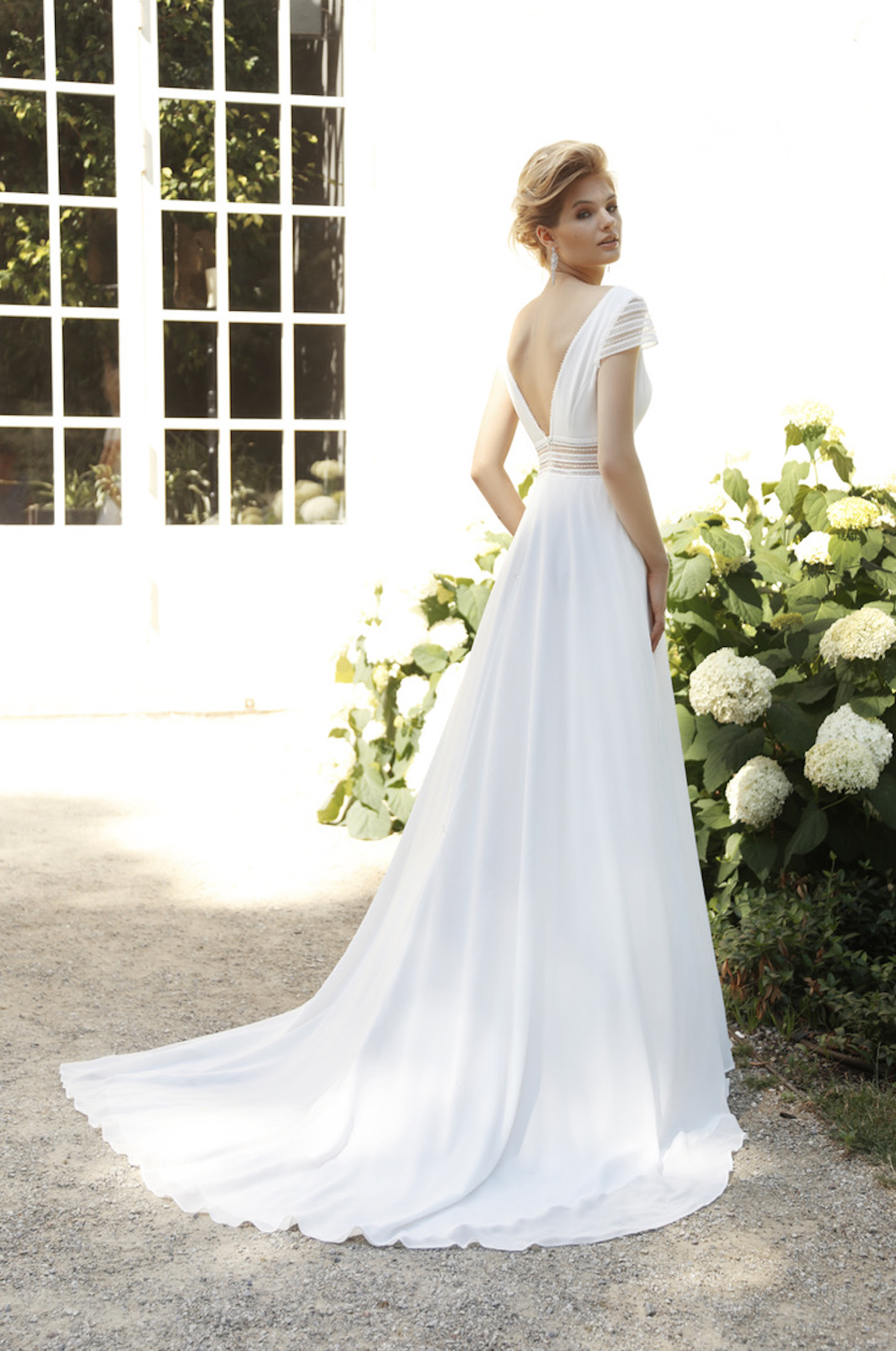 Eigenschaften: klassischer Schnitt, glatt, Georgette, V-Ausschnitt, mit Trägern, kurze Ärmel, mit Schleppe