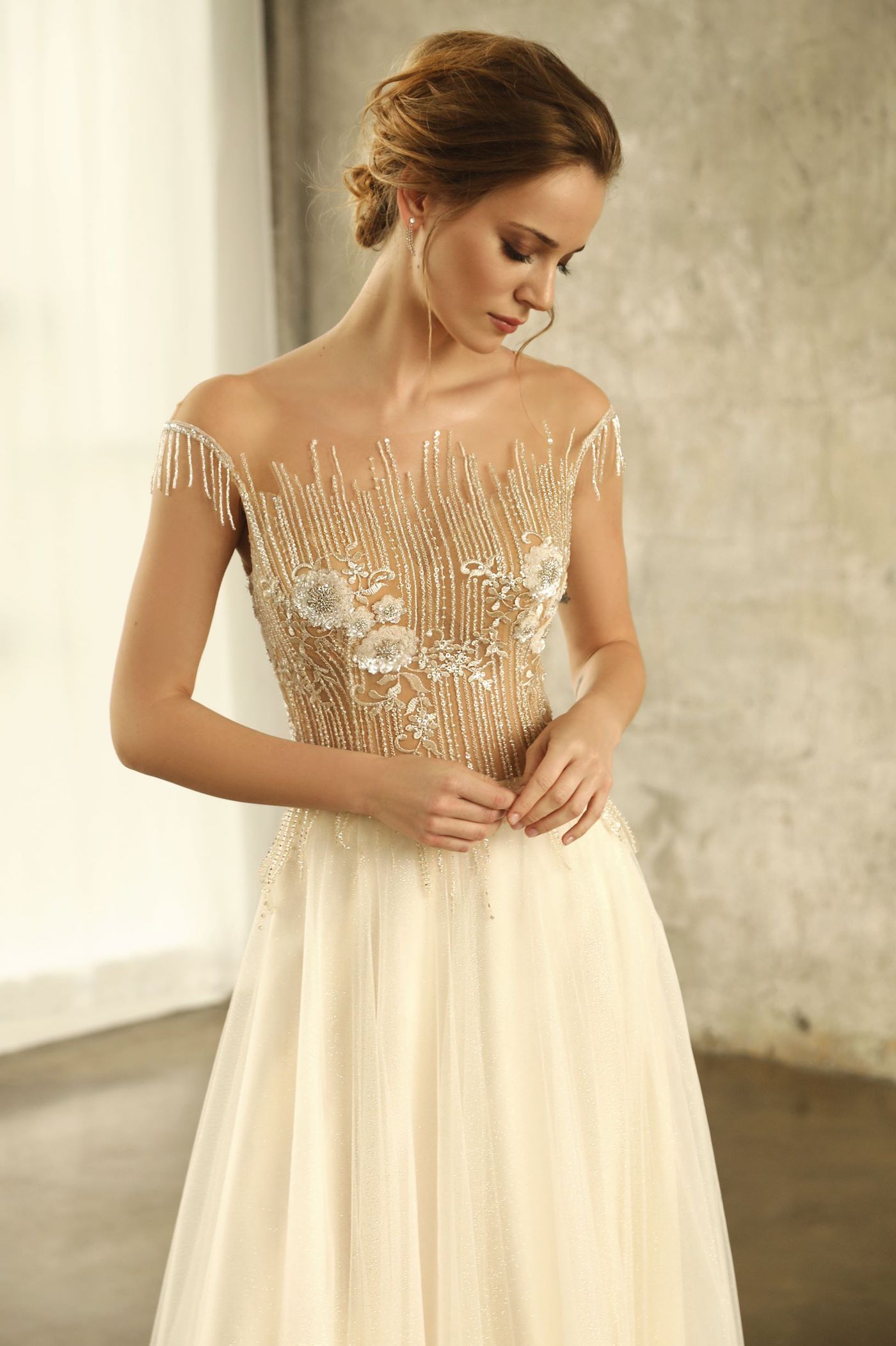 Neu im Atelier: Ein Traum von Brautkleid. Golderner Glitzertüll im Rock und ein funkelndes Oberteil mit zauberharften 3D Blumen.